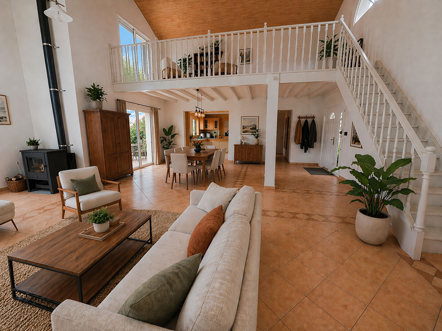 Le coeur de la maison s'articule autour d'un salon cathédrale impressionnant, réchauffé par un poêle à bois et baigné de lumière grâce à ses larges baies vitrées. Dans le prolongement, une cuisine dînatoire conviviale et une mezzanine élégante (idéale pour une bibliothèque) complètent cet espace de vie tourné vers l'extérieur.