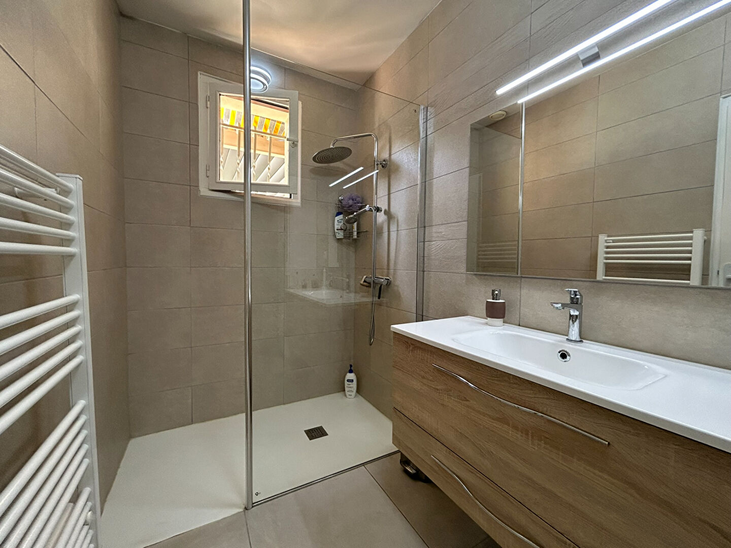 Profitez d'une entrée avec placards, d'une vaste pièce de vie baignée de lumière avec climatisation et cheminée. La cuisine, séparée, dispose d'un coin repas et d'un accès à la terrasse.