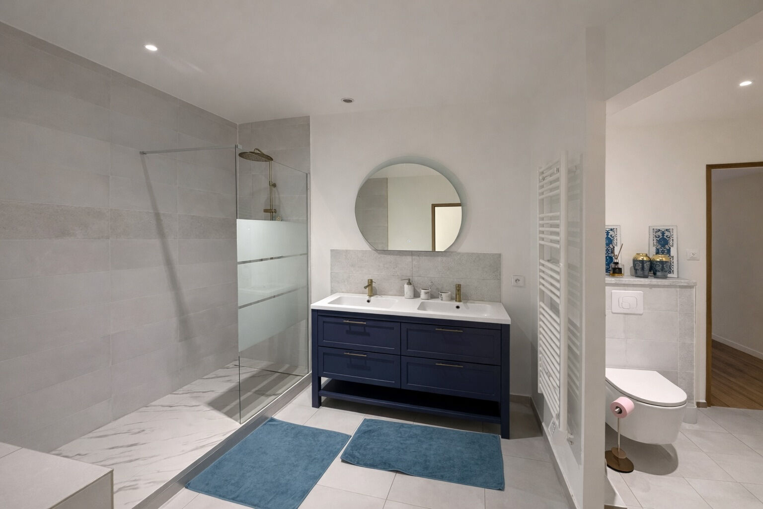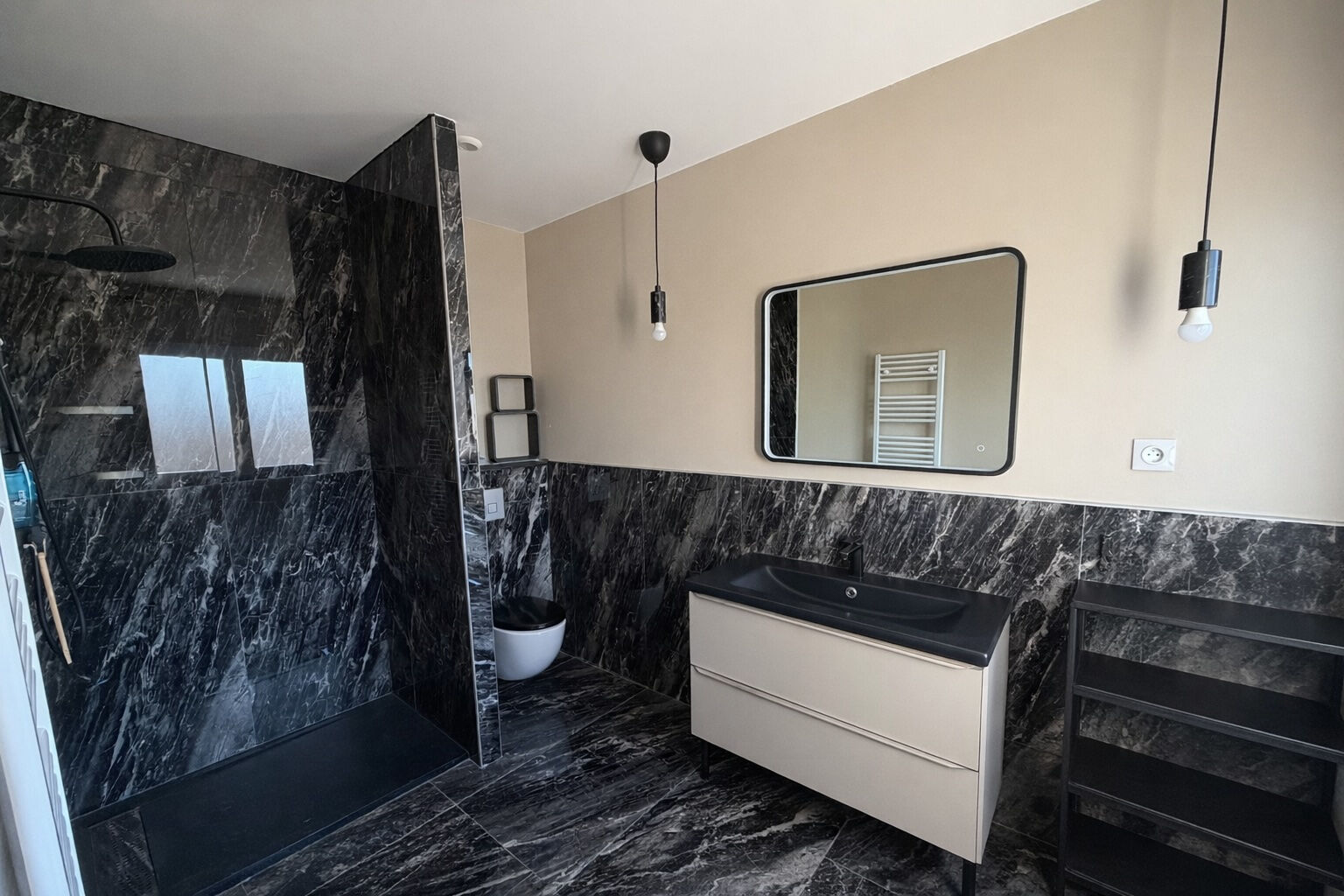 À l'étage, chacun trouve naturellement sa place grâce aux cinq chambres, dont une suite parentale avec dressing et salle d'eau privative avec WC, conçue comme un espace de confort à part entière. Une seconde salle d'eau avec WC vient compléter l'ensemble.