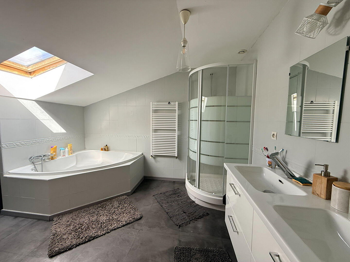 Au 1er étage : 3 belles chambres avec dressings intégrés, mais aussi une salle de bain spacieuse distribuant douche, baignoire et double vasque. Un second WC vient compléter le niveau.