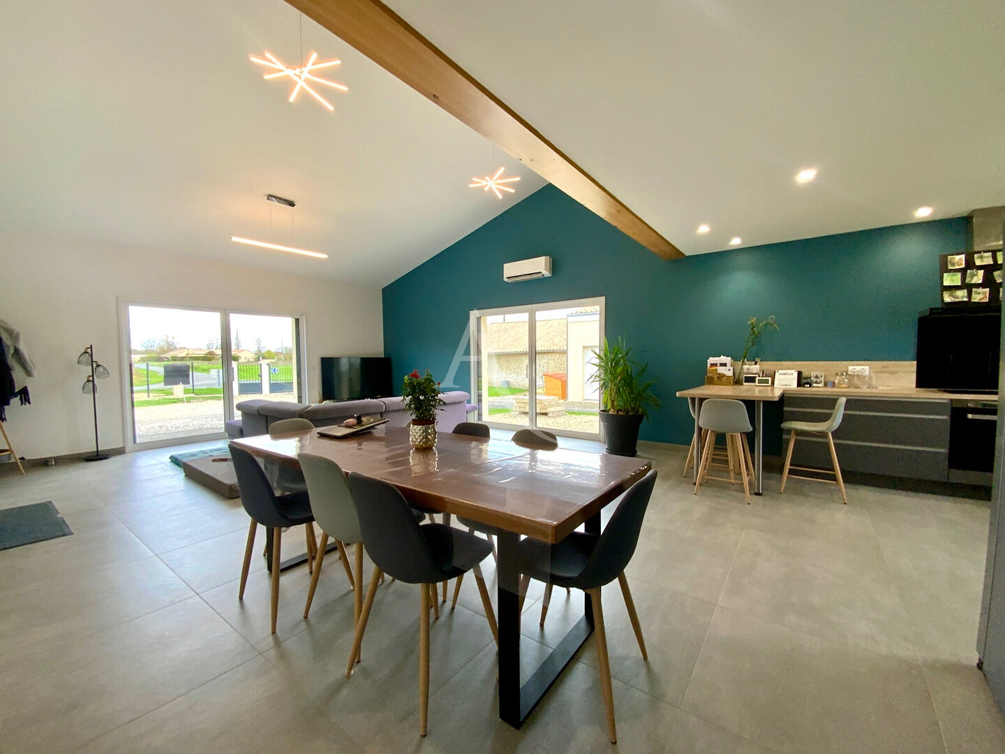 L'intérieur propose un beau séjour agrémenté de larges baies vitrées à galandage.