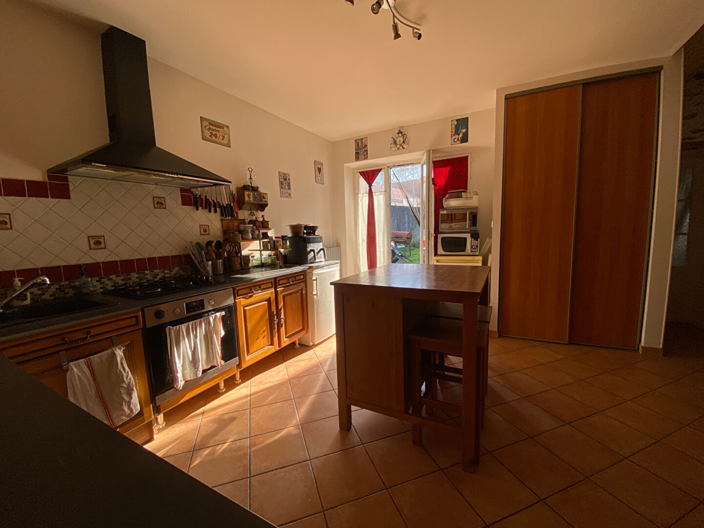 La cuisine est entièrement aménagée et équipée, avec un accès direct sur le jardin.