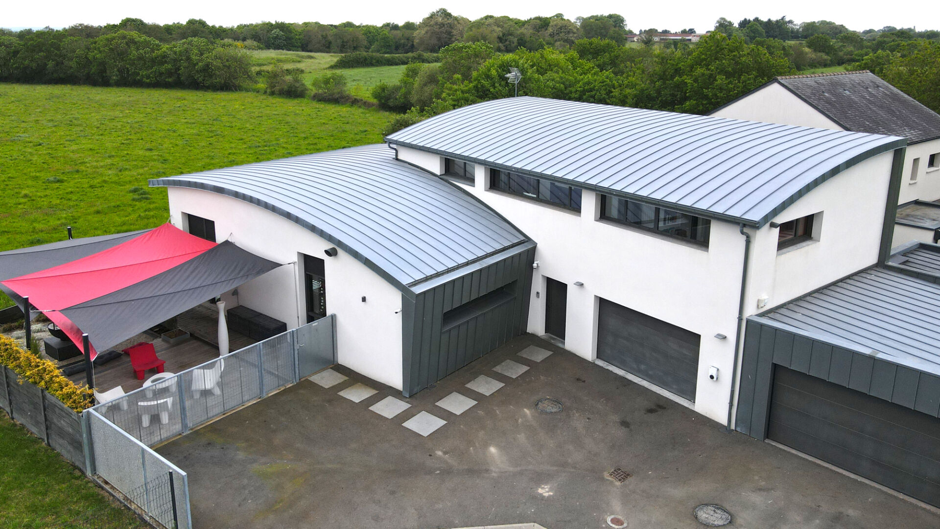 Cette maison se compose d'une entrée avec porte automatique donnant sur un salon/salle à manger en toit cathédrale, cuisine aménagée équipée réalisée par un designer Nantais, une suite parentale avec dressing et salle de bains (douche a l'italienne, double vasque et baignoire balnéo).