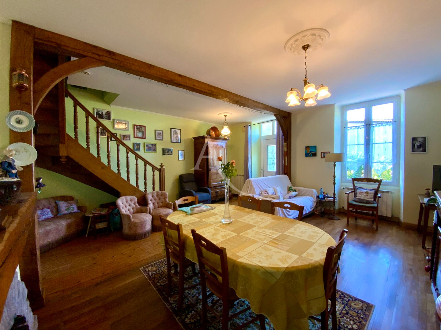 Maison principale d'environ 170 m2, celle-ci est composée au rez-de-chaussée d'un salon/salle à manger avec cheminée ouverte, une cuisine aménagée, une véranda chauffée avec clim réversible et cheminée avec insert, une chambre, une SD, wc. A l'étage, un palier desservant 5 chambres et une SD avec wc.