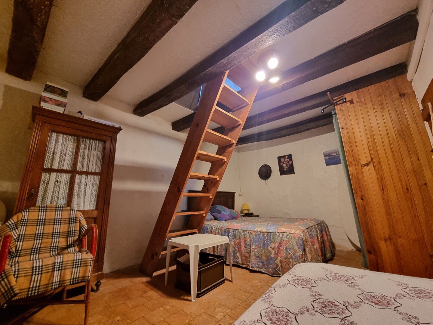 Elle offre une pièce de vie avec coin cuisine, un espace nuit et une salle d'eau au rez-de-chaussée, ainsi qu'une chambre et un grenier à l'étage.