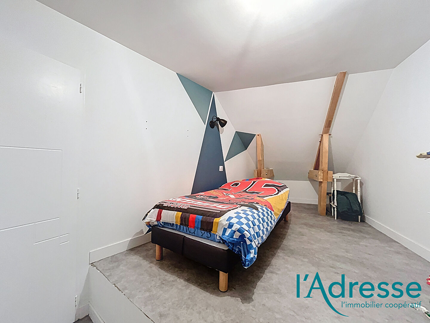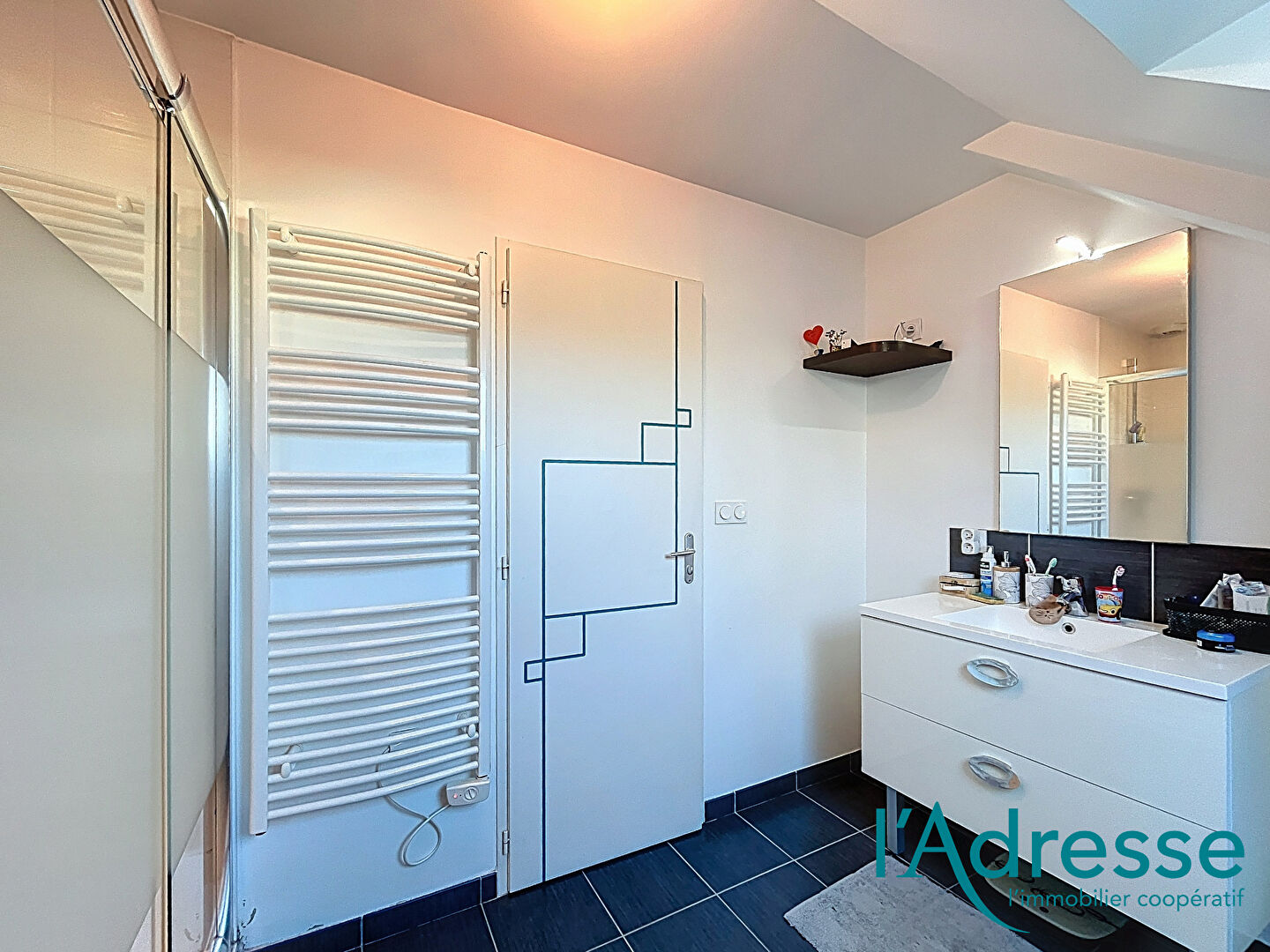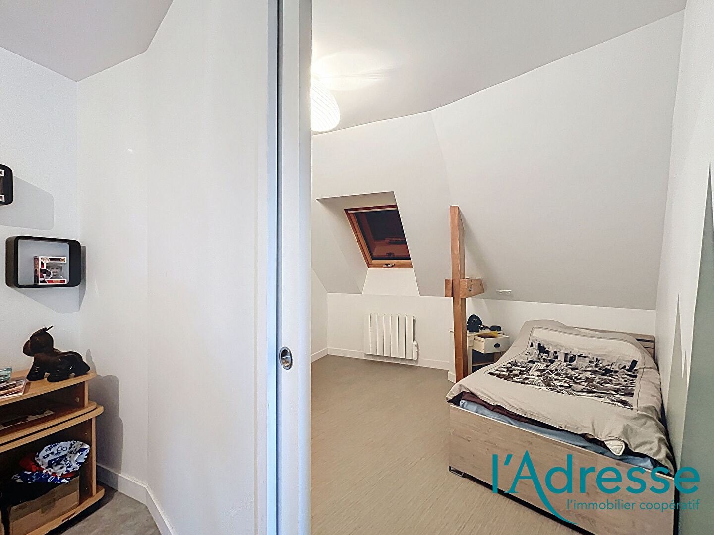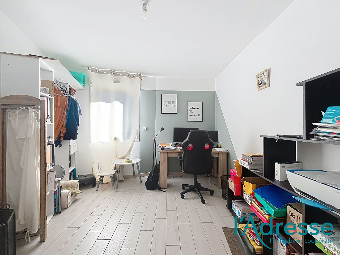À l'étage, une mezzanine offre un espace idéal pour un bureau ou un coin détente. Deux chambres avec placards intégrés, une salle d'eau moderne, un WC indépendant ainsi qu'un bel espace nuit supplémentaire parfait pour imaginer une future suite parentale complètent ce niveau.