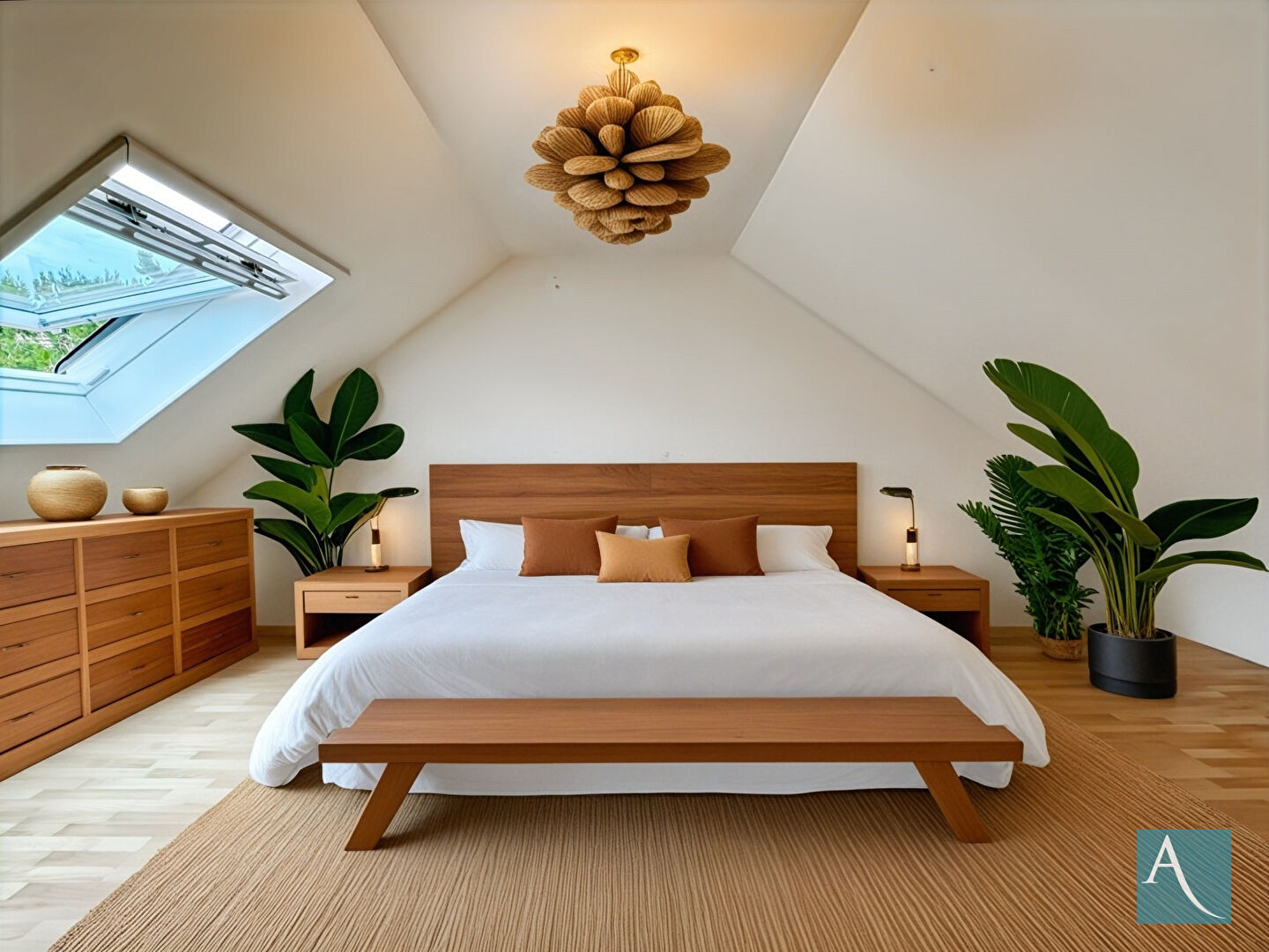 À l'étage : 2 chambres supplémentaires (29 m² et 25 m² au sol), salle d'eau avec WC