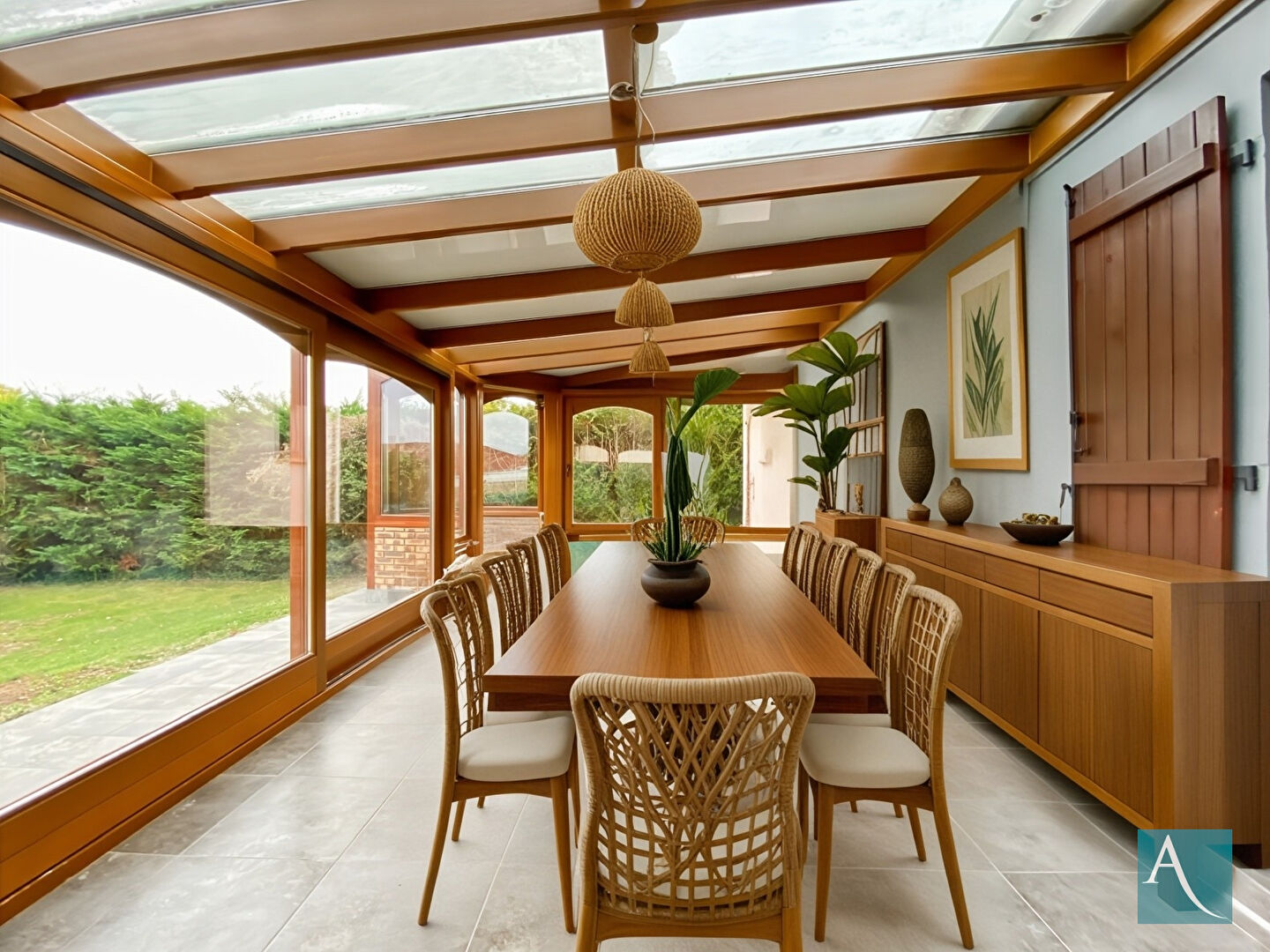 À l'arrière, le jardin clos de 660 m² devient un prolongement naturel de la maison : végétation maîtrisée, calme absolu, et une vraie impression d'évasion. On imagine facilement des week-ends barbecue, des enfants courant pieds nus dans l'herbe ou un hamac tendu entre deux arbres.
