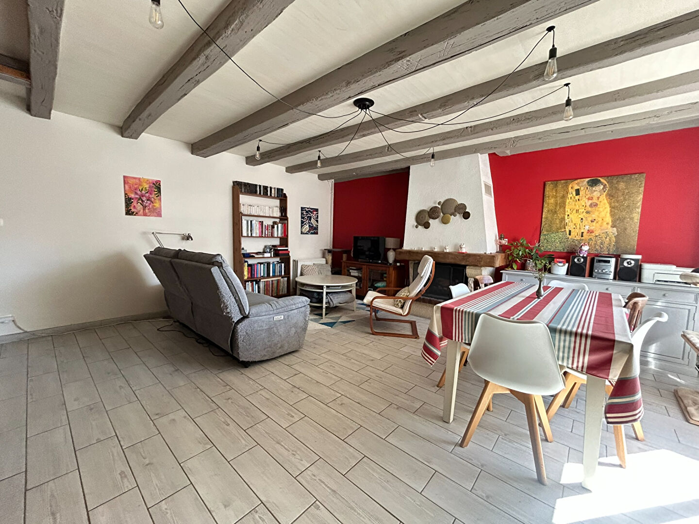 Dès l'entrée, vous découvrirez une cuisine aménagée et équipée, ainsi qu'un salon-séjour chaleureux bénéficiant d'une exposition Ouest, idéal pour profiter de la lumière en fin de journée. Le charme de l'ancien opère immédiatement avec ses poutres apparentes et son ambiance conviviale.