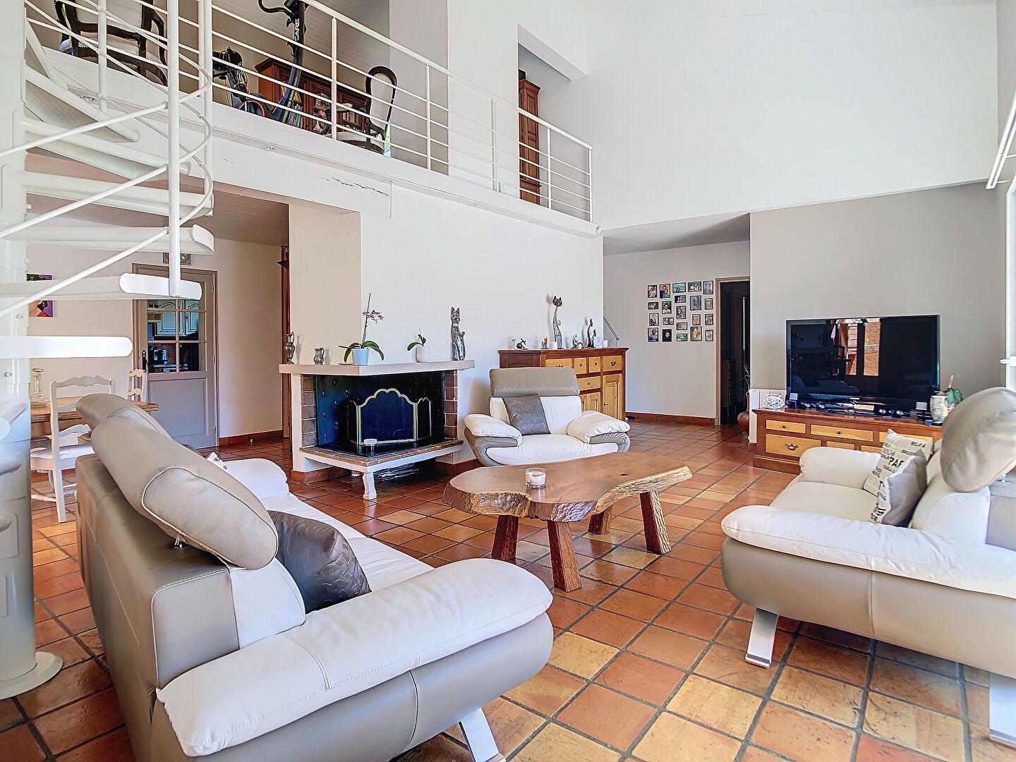 Elle se compose d'un hall d'entrée donnant sur un double séjour lumineux avec hauteur cathédrale, sa cheminée centrale à foyer ouvert et une rochelle baignée de lumière, le tout climatisé offrant un espace de vie cumulé de plus de 70 m². Une belle cuisine dinatoire indépendante aménagée et équipée.