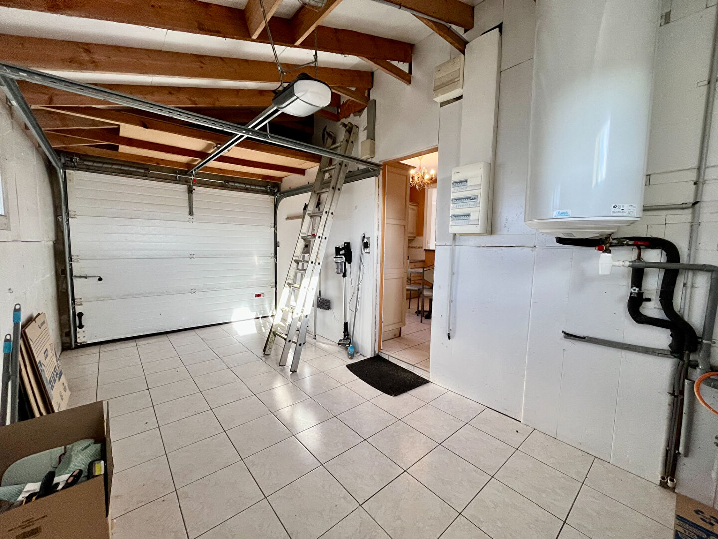 Un garage carrelé.