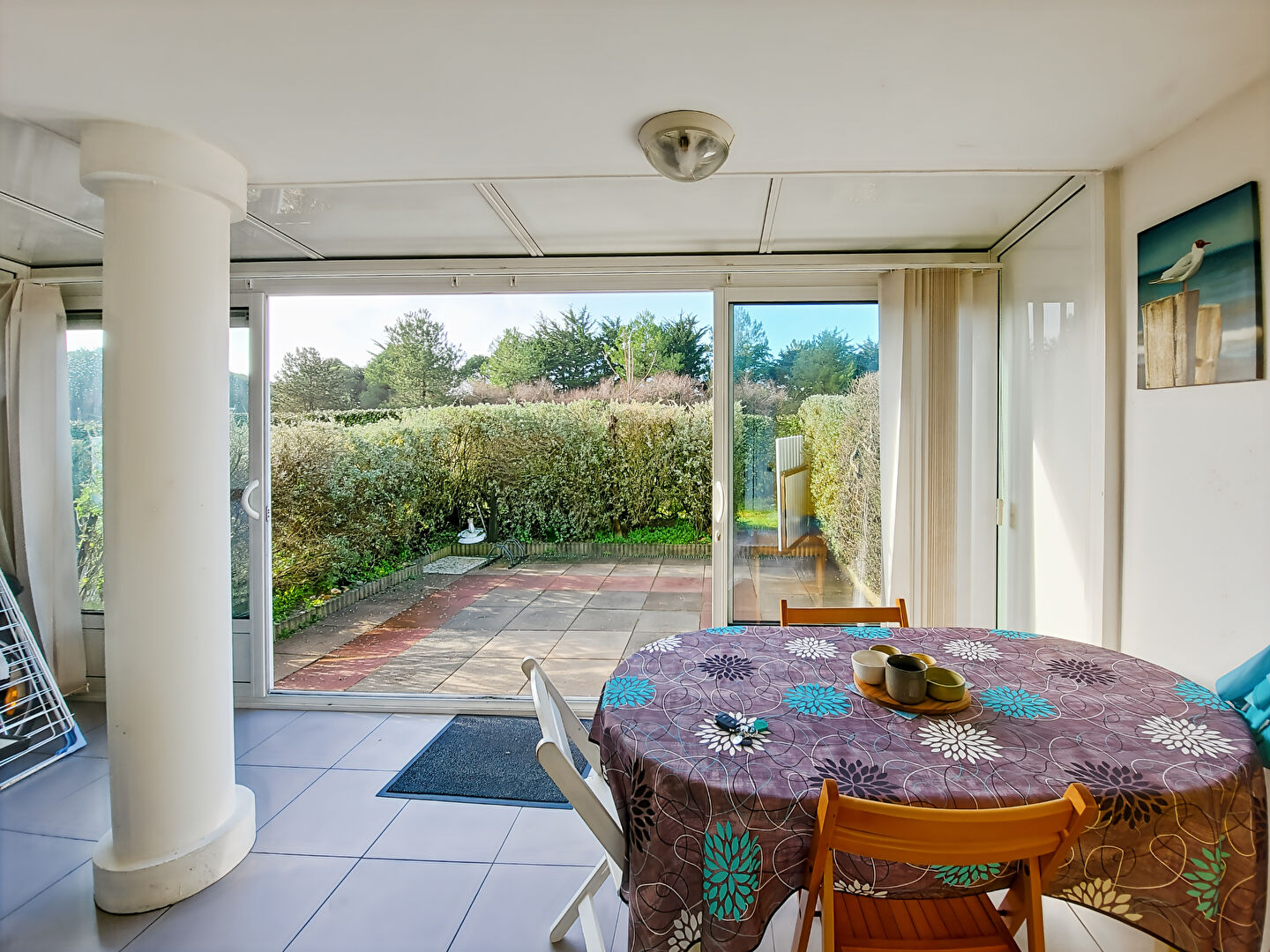 Véranda récente avec ses baies coulissantes donnant un accès sur le jardinet exposé SUD. Séjour avec coin cuisine aménagé et équipé. Baie à galandage. Petite chambre meublée. En mezzanine, un coin couchage et un autre de rangement. Parking privé.