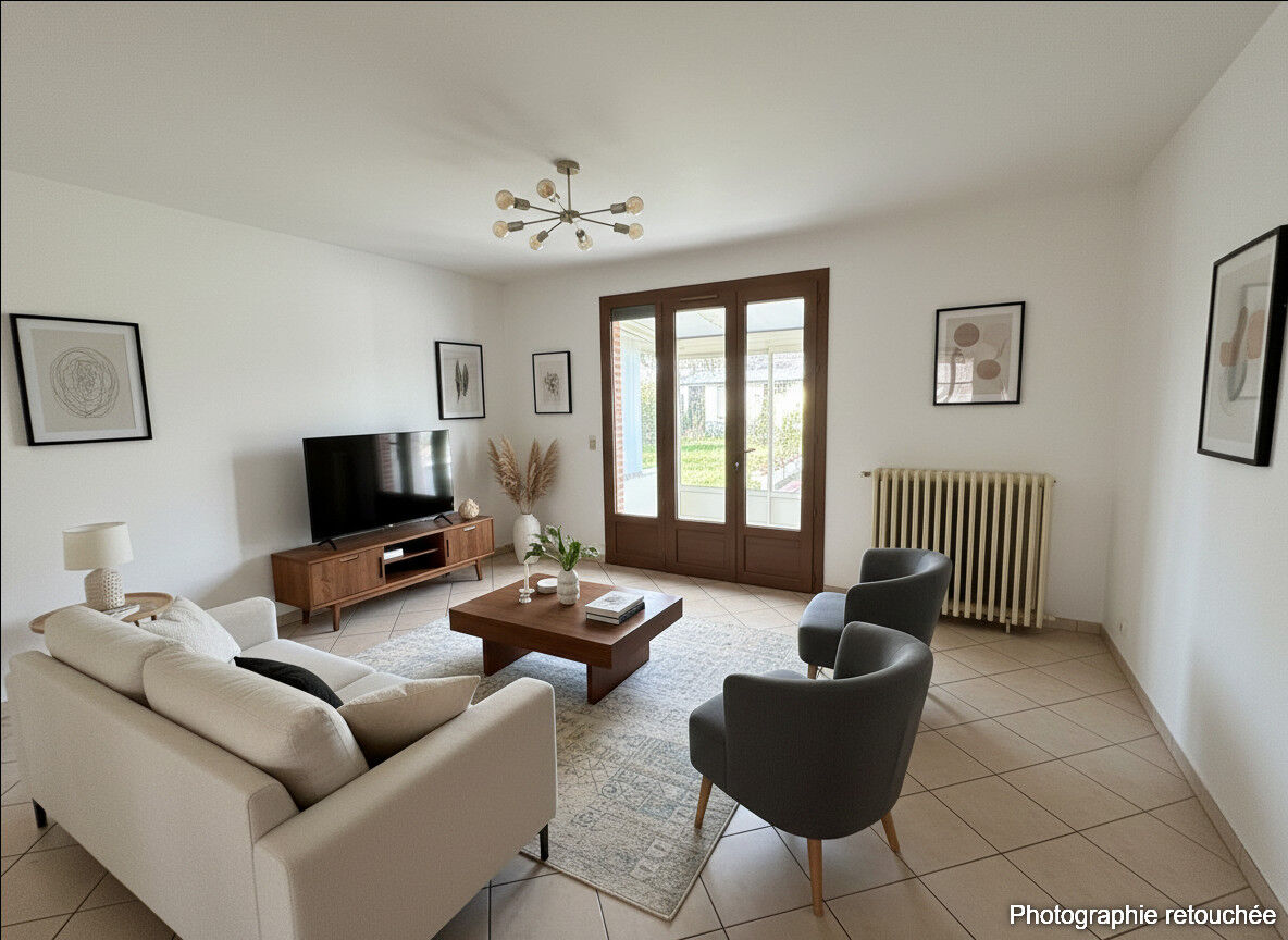 Un salon-séjour convivial donnant sur une véranda lumineuse, parfaite pour profiter du jardin en toute saison,
