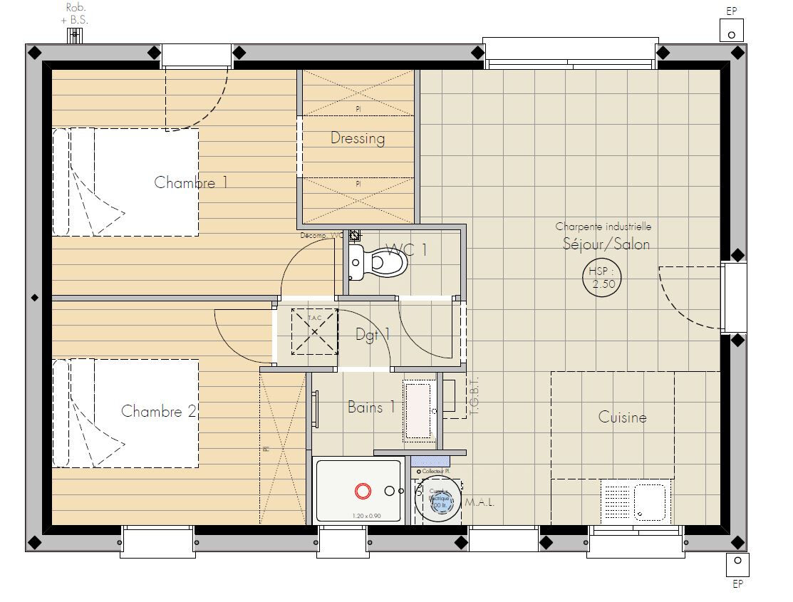 Nous vous proposons cette maison neuve, de Type 3 d'environ 49.57 m². Composée d'une pièce de vie, deux chambres, une salle d'eau, un wc, sur un terrain de 343 m².