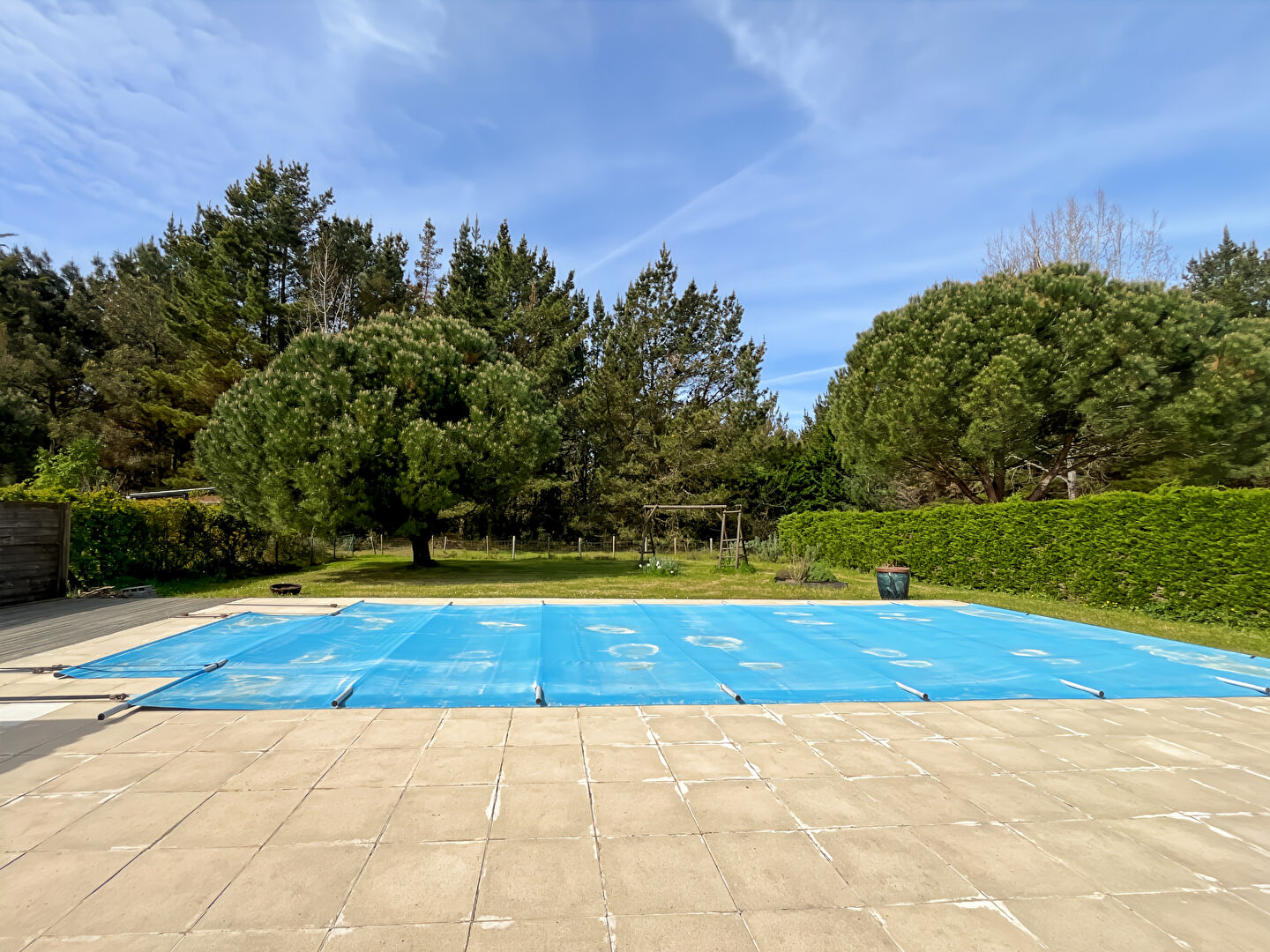 À l'extérieur, vous profiterez d'une agréable terrasse donnant sur une grande piscine, avec une vue dégagée sur la forêt, parfaite pour des moments de détente en toute tranquillité.
