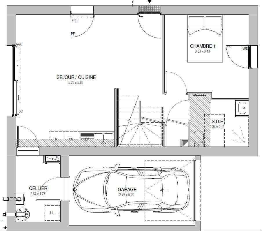 Au rez-de-chaussée : séjour/cuisine de 30 m², cellier, une chambre, salle d'eau avec WC.