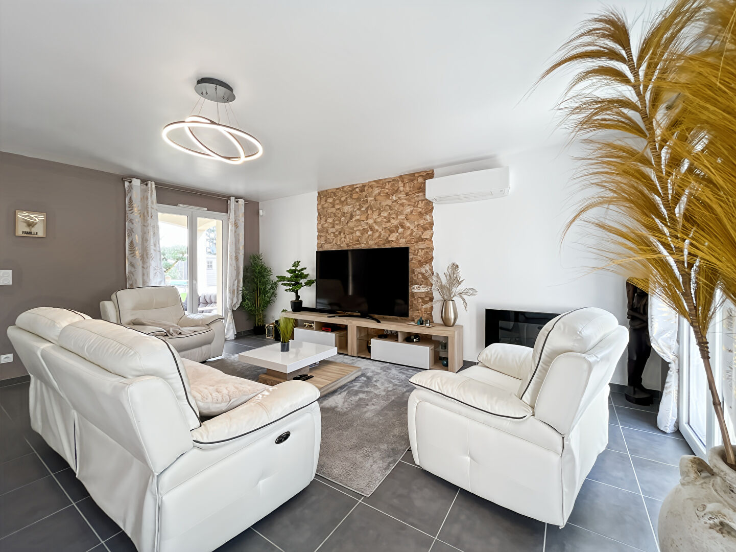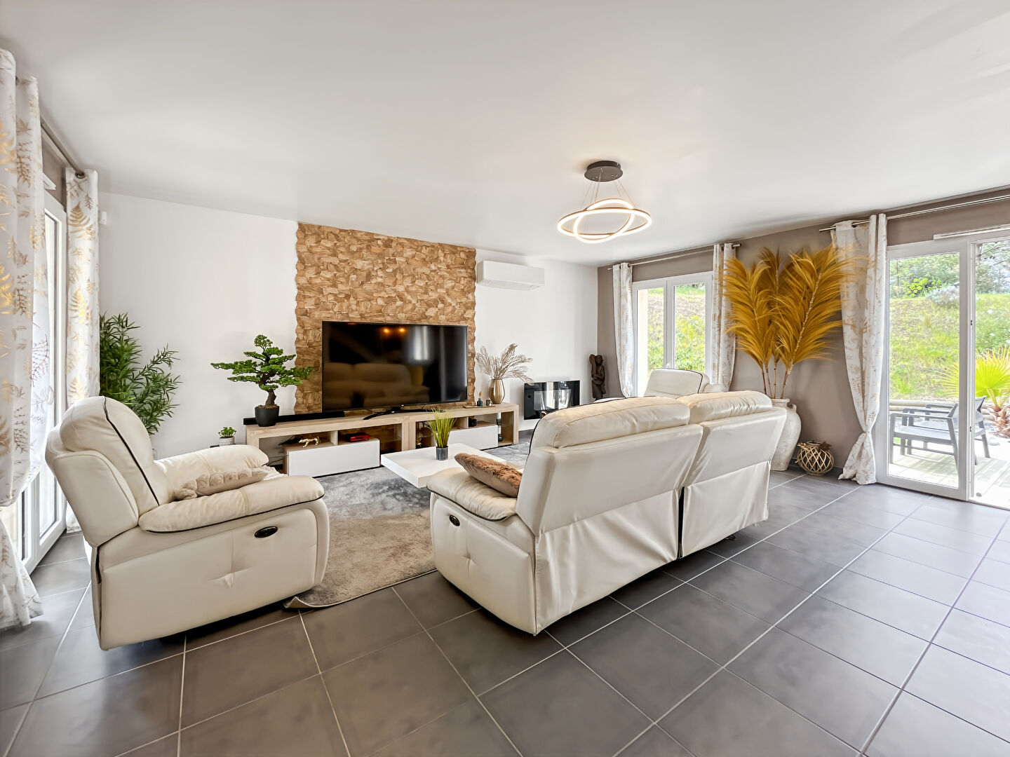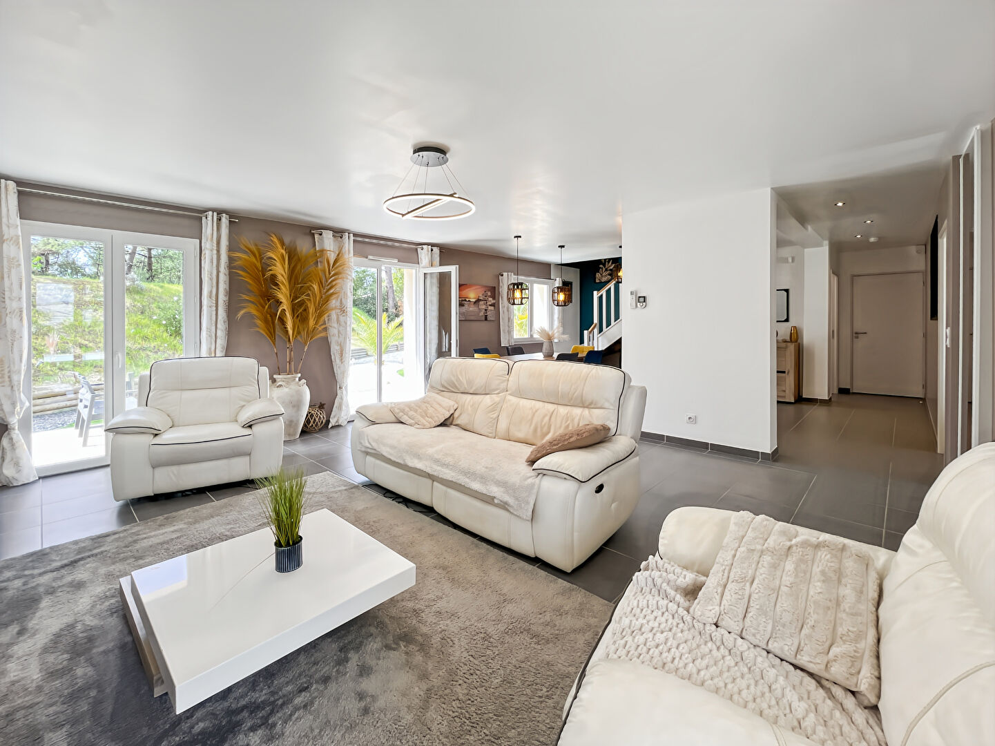 Dès l'entrée, vous découvrirez une superbe pièce de vie lumineuse de près de 45m², avec une cuisine aménagée et équipée, idéale pour partager des moments conviviaux en famille ou entre amis. De larges ouvertures offrent une belle luminosité et une continuité naturelle vers l'extérieur.