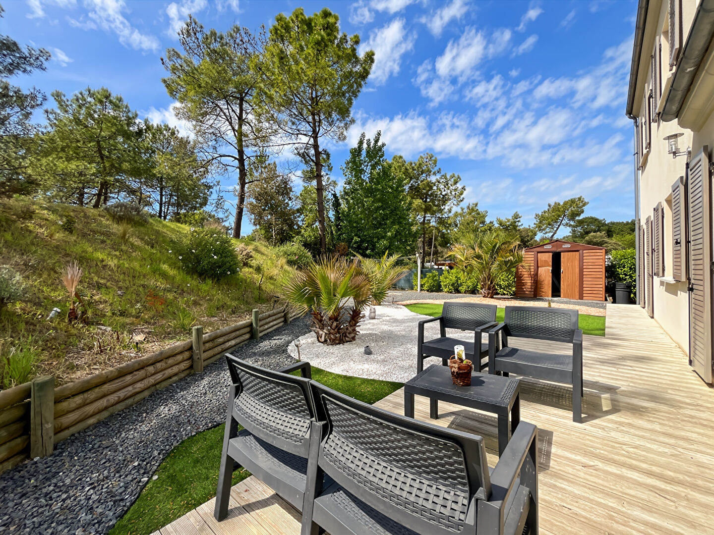 À l'extérieur, le charme opère immédiatement : un jardin arboré sans vis-à-vis et une piscine. Un véritable cocon pour profiter pleinement des beaux jours en toute intimité
