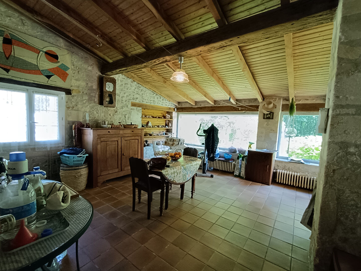 Produit atypique , au calme , à 5min des commerces : Belle maison en pierres comprenant: entrée, grand salon séjour avec moellons, 3 chbres, bureau, cuisine aménagée et équipée de 30m², arrière cuisine, pièce avec cuisine d'été, salle d'eau, wc , dégagement et dépendances.