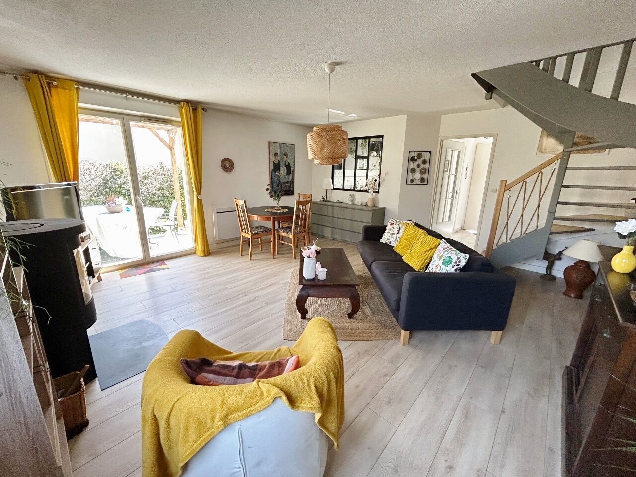 Venez poser vos meubles et vos valises et profitez de son séjour de 27 m², avec poêle à bois et donnant sur la cuisine équipée et récente.