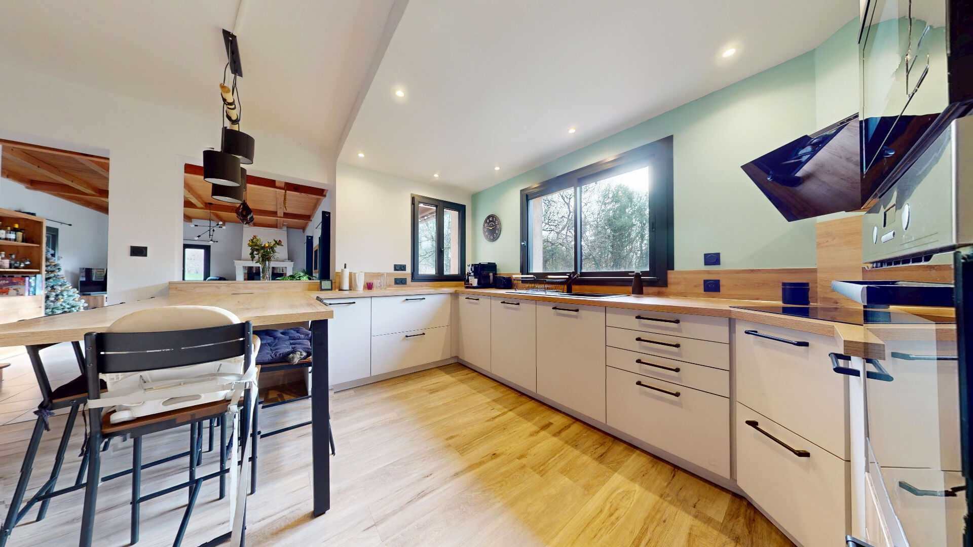 La cuisine, aménagée et entièrement équipée Schmidt (2023), s'accompagne d'un cellier discret et fonctionnel, pensé pour un confort optimal au quotidien.