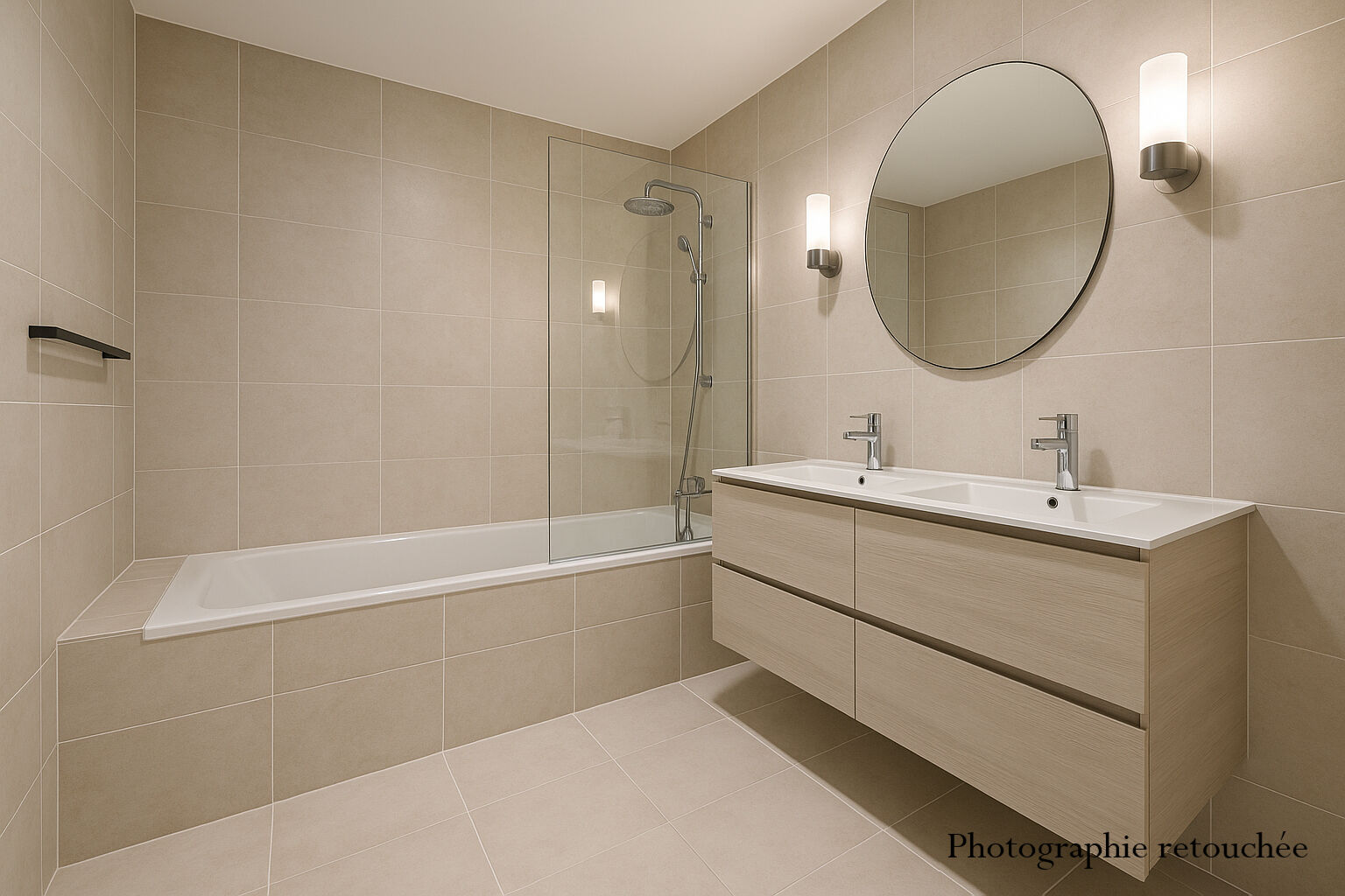 Le rez-de-chaussée comprend également une chambre et une salle d'eau attenante, permettant la création d'une suite parentale et offrant la possibilité d'une vie de plain-pied. Un WC séparé vient compléter ce niveau, ainsi qu'un grand garage attenant équipé d'une porte de garage électrique pour plus de confort au quotidien.