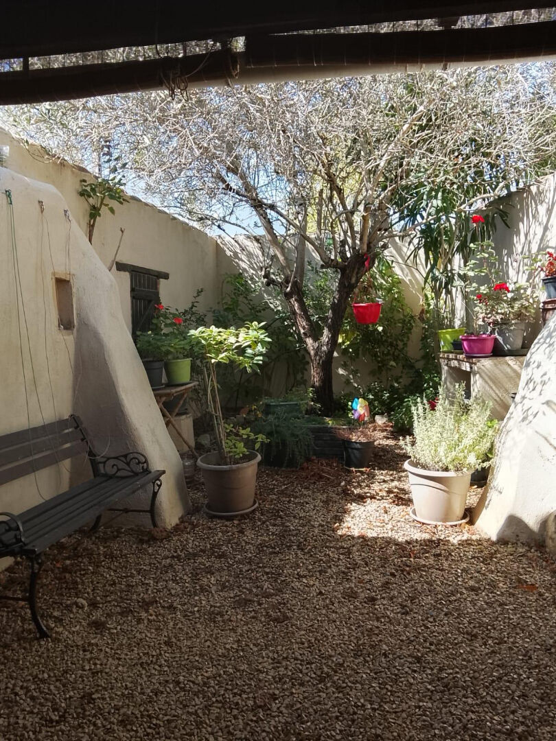 Terrasse couverte ouvrant sur un jardinet intimiste.