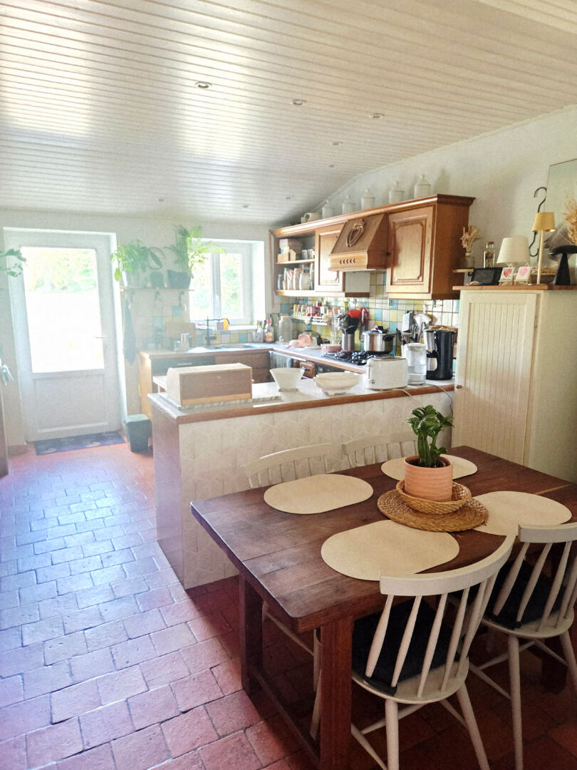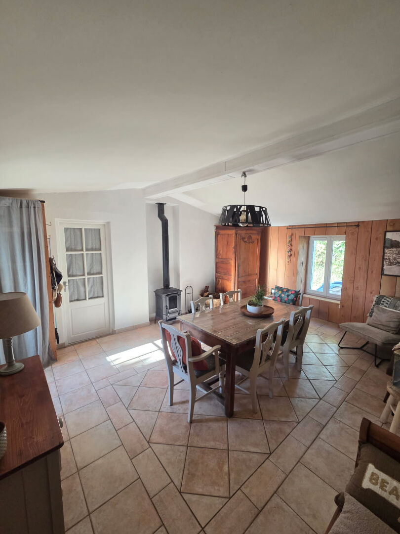 Maison en pierres comprenant un salon avec poêle à pelé, un séjour avec poêle à bois, une cuisine meublée et équipée avec salle à manger, une chambre avec salle d'eau.