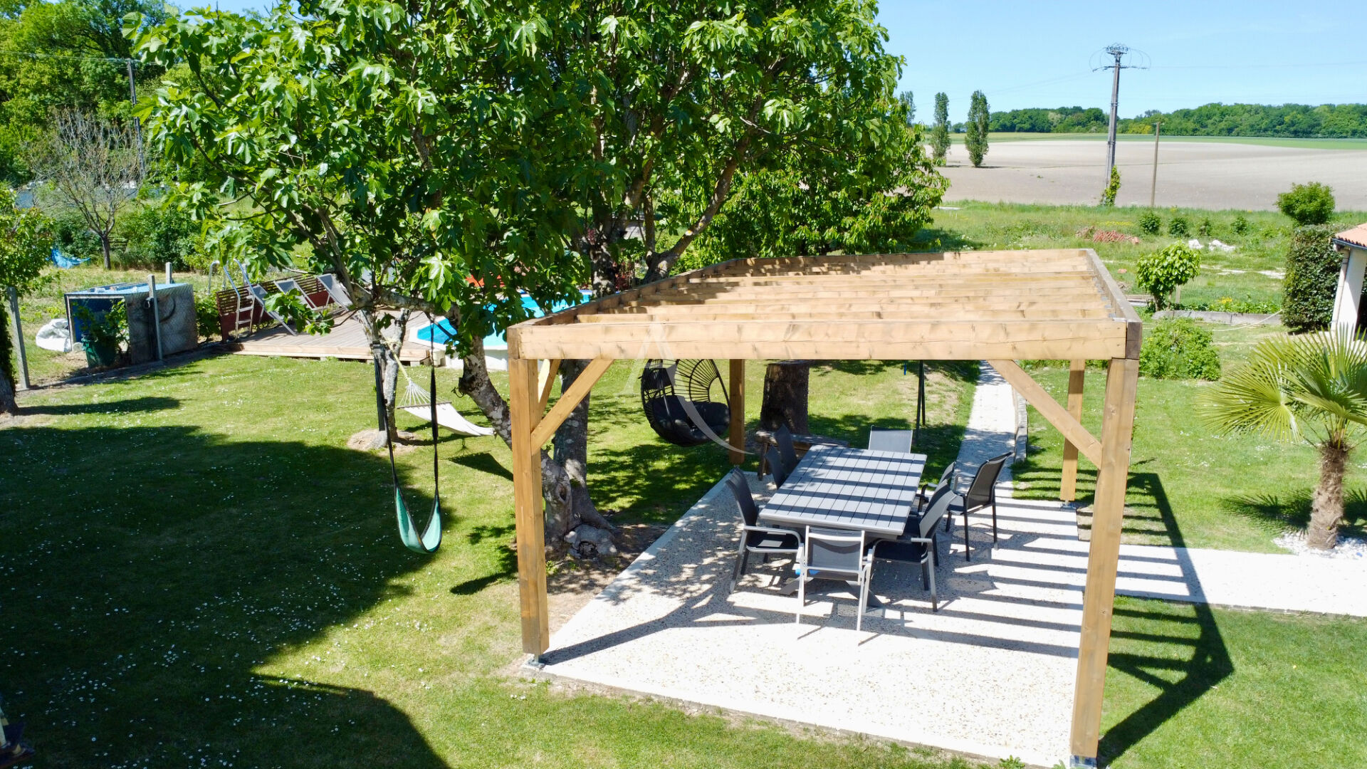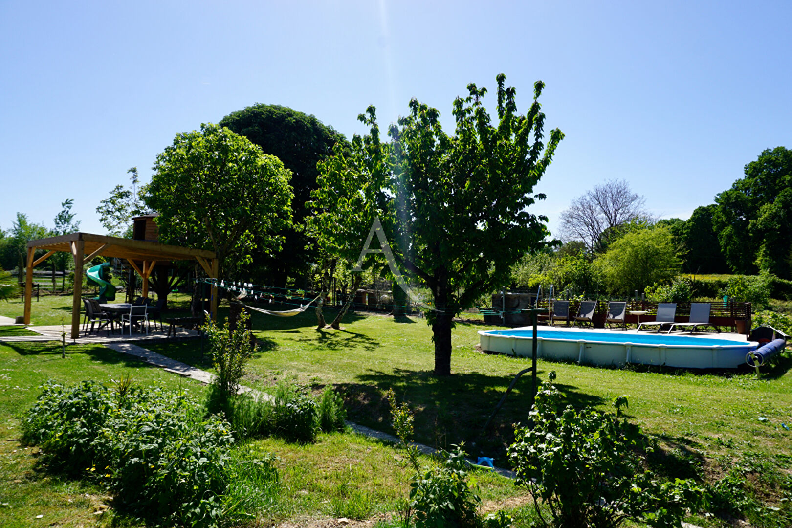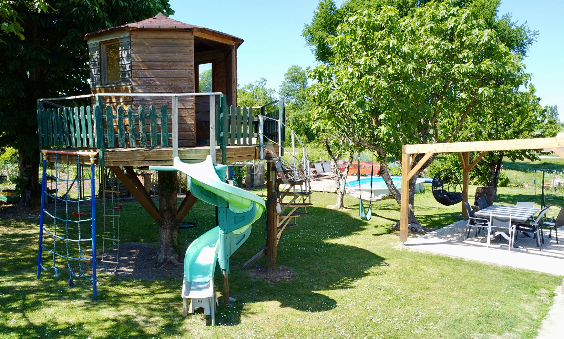 De la salle à manger, vous arriverez sur une terrasse avec pergola, au centre du jardin, vous permettant de profiter, à la fois de la piscine semi enterrée, et de garder un oeil sur vos enfants se fabriquant aventures et souvenirs dans la cabane en hauteur.
