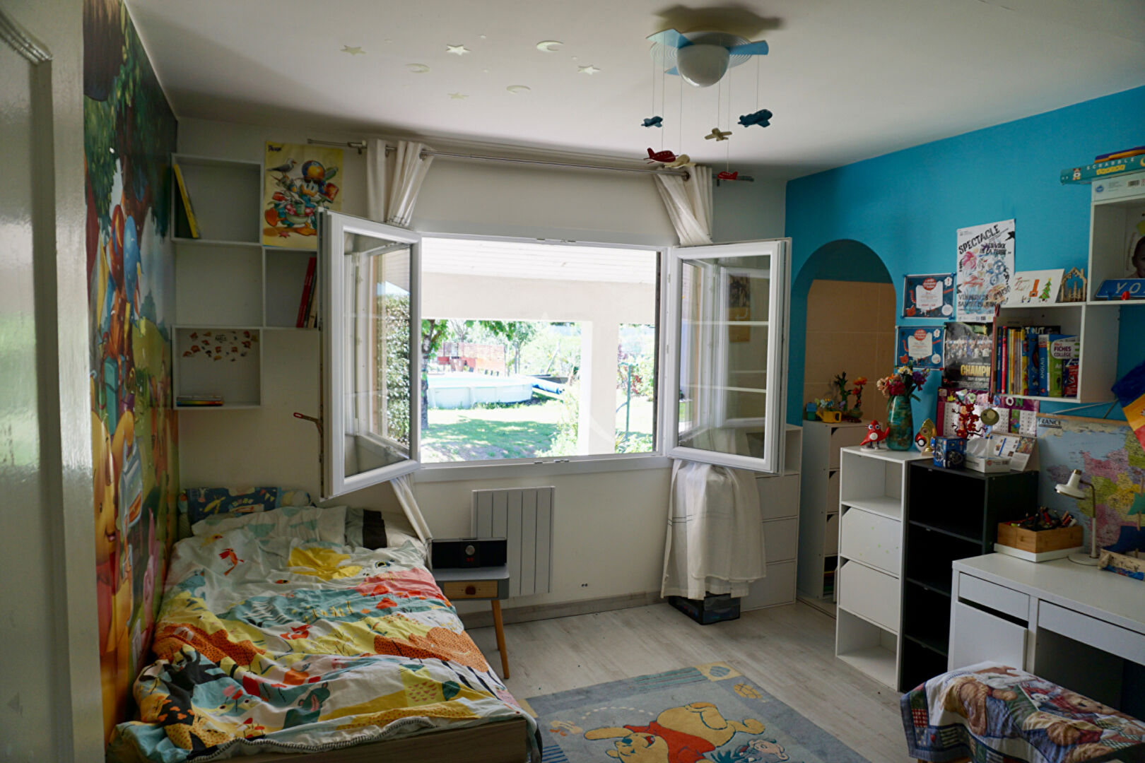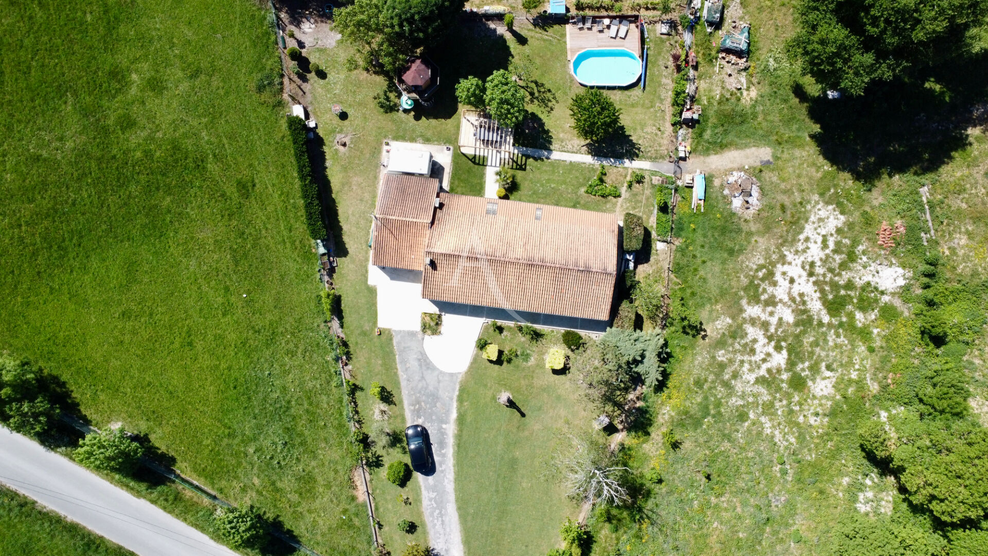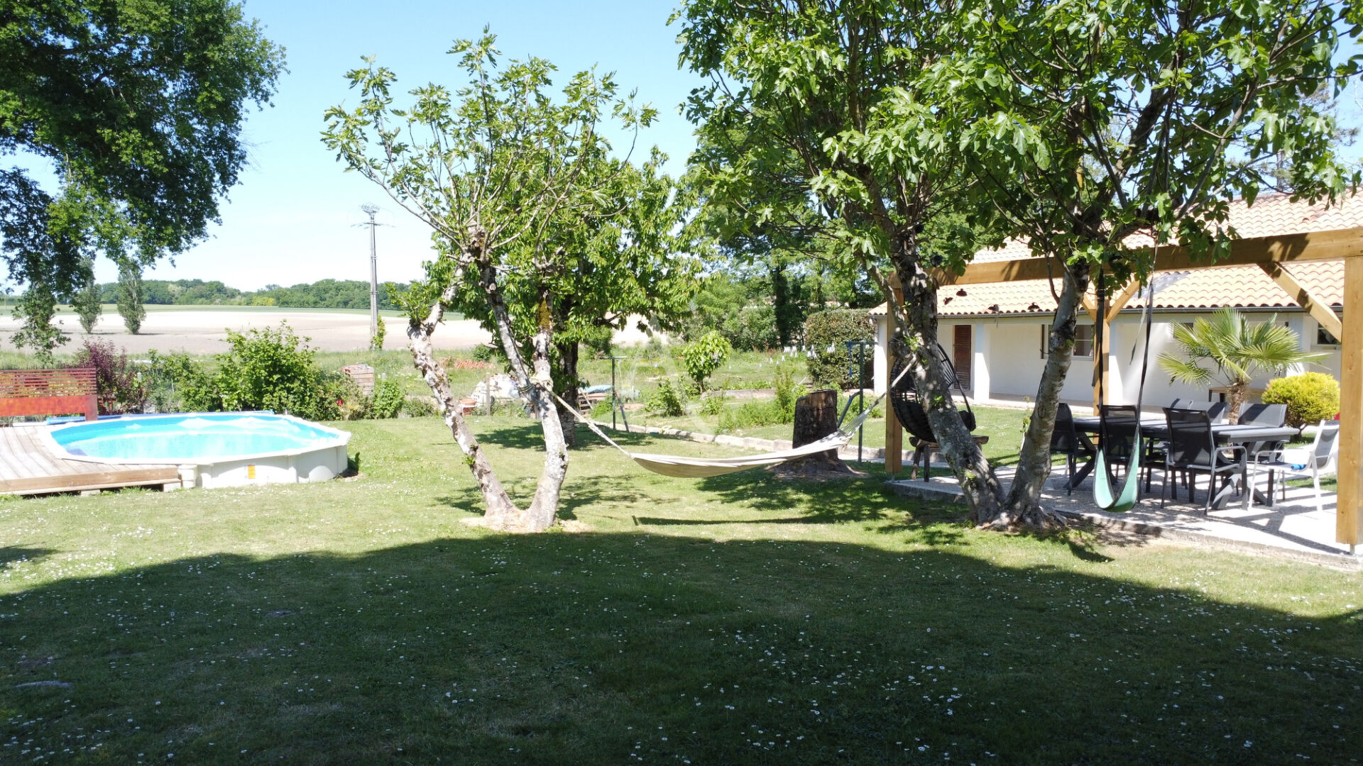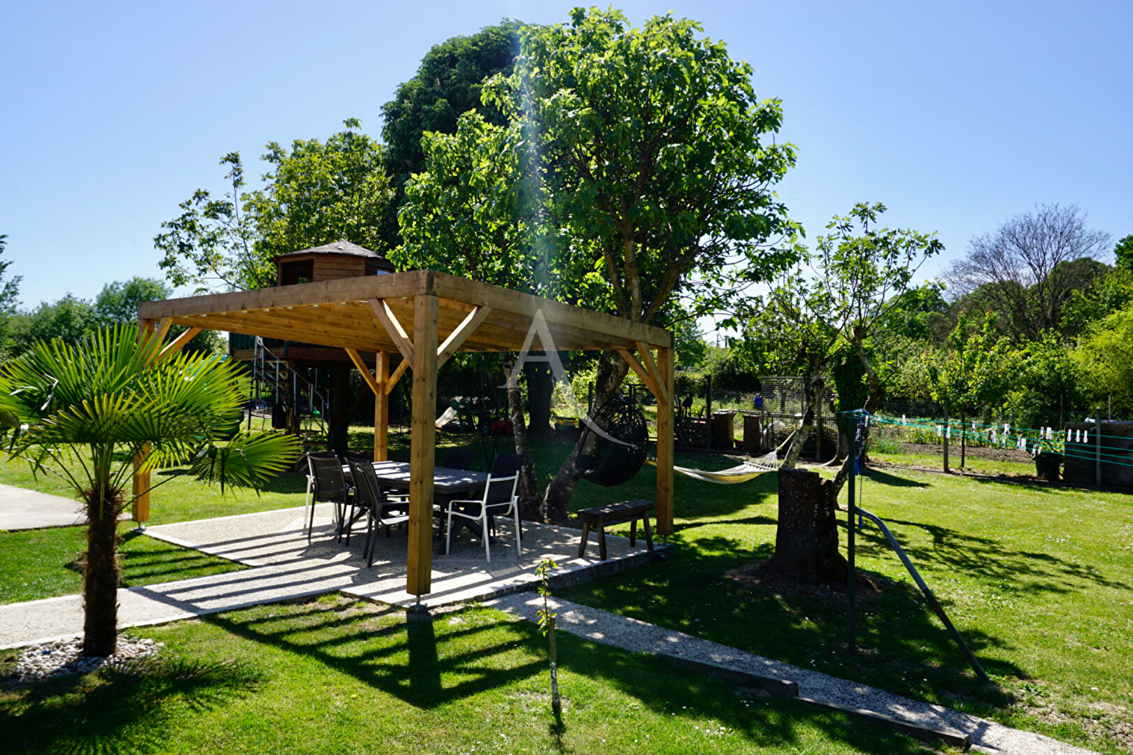 De la salle à manger, vous arriverez sur une terrasse avec pergola, au centre du jardin, vous permettant de profiter, à la fois de la piscine semi enterrée, et de garder un oeil sur vos enfants se fabriquant aventures et souvenirs dans la cabane en hauteur.