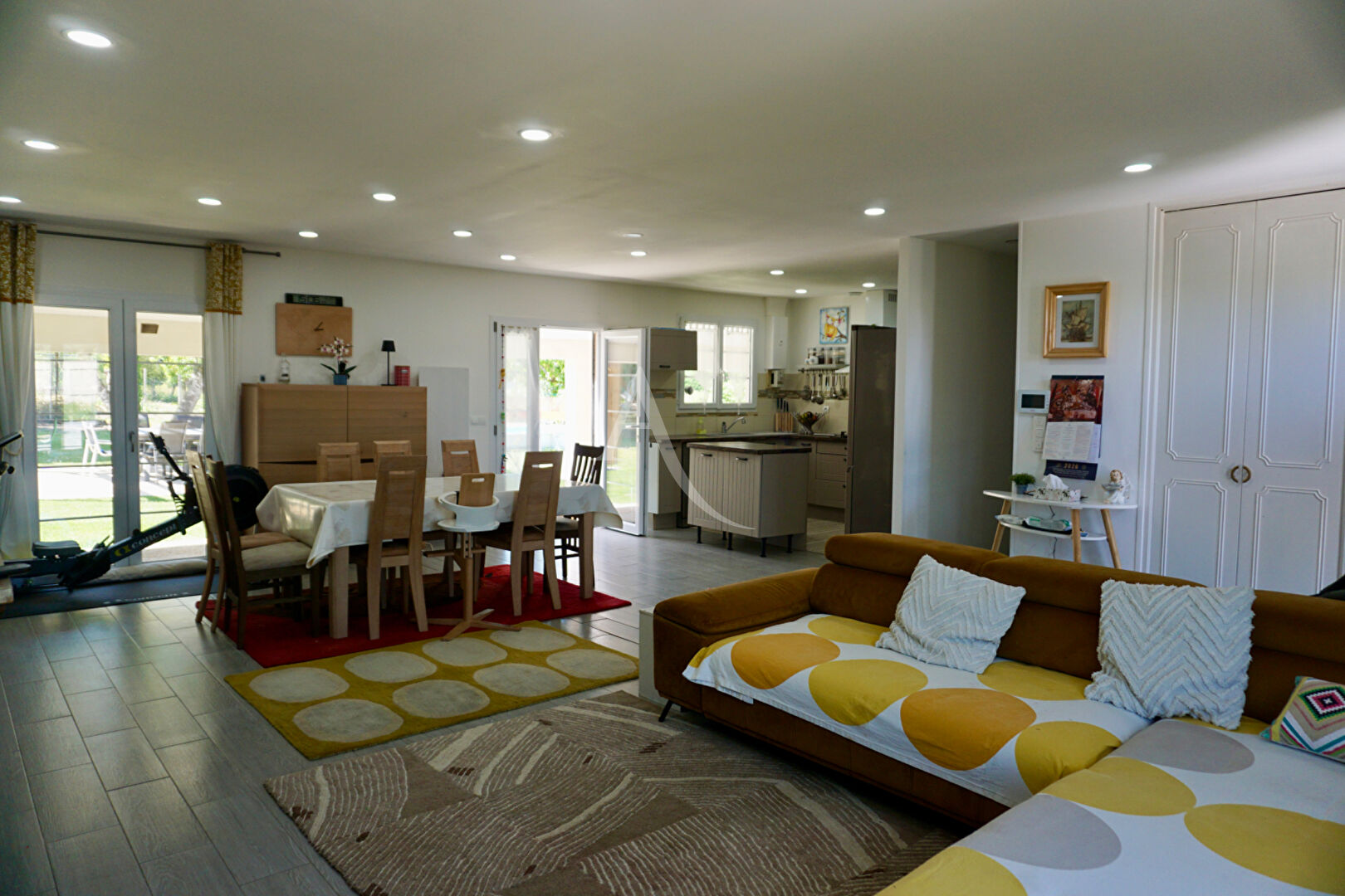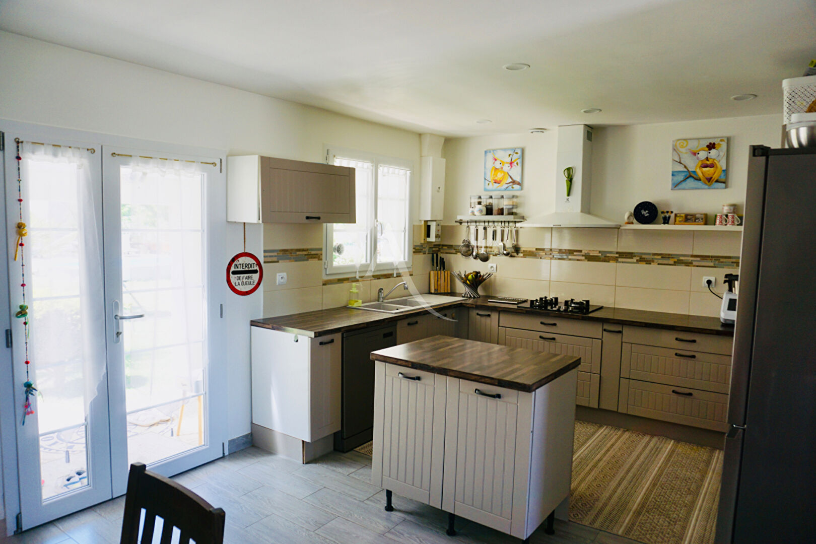 Entre l'espace salle à manger et le jardin, la cuisine ouverte et aménagée, avec son îlot vous permettra de profiter de moments conviviaux.