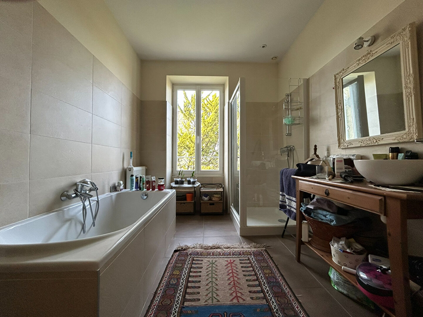 Elle se compose de beaux volumes de vie, ayant conservé le charme de l'ancien, agencés entre une cuisine et un séjour lumineux ouvrant sur un jardin sans vis-à-vis.