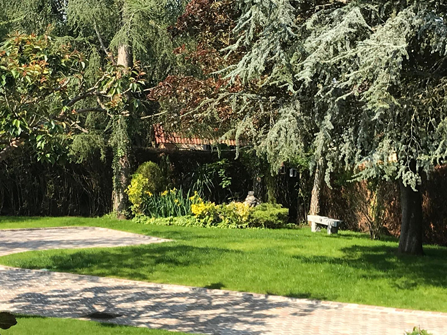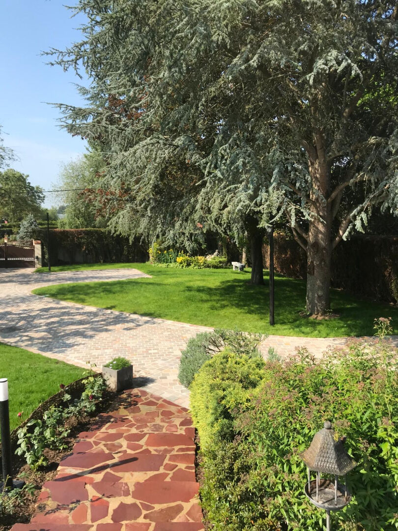 Le portail automatique s'ouvre sur un bel espace arboré et pavé pouvant accueillir plusieurs véhicules.