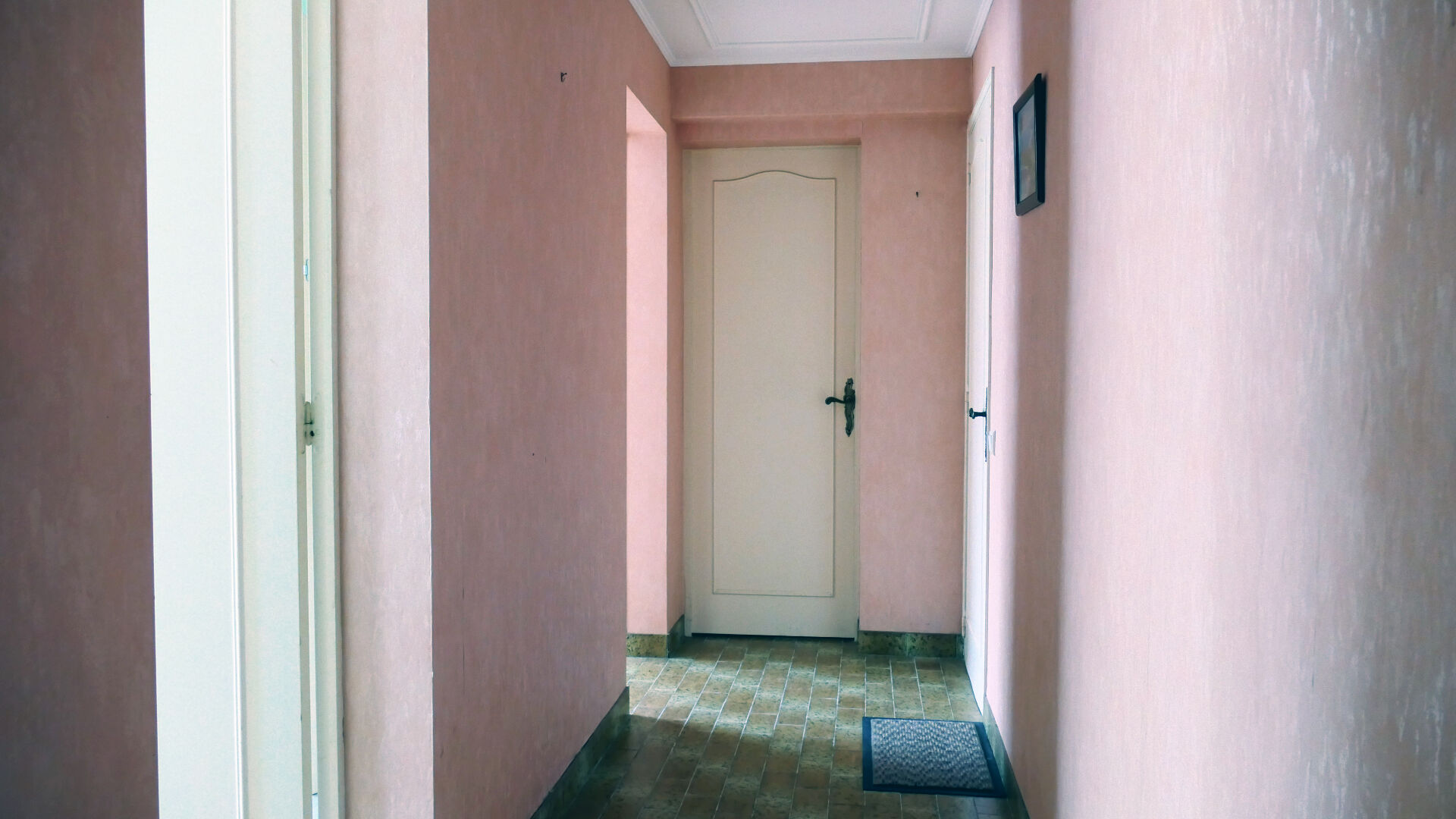 Un appartement au rez-de-chaussée comprenant un salon, une cuisine, un dégagement, deux chambres, une salle d'eau et un WC avec lave-mains et sèche-mains.