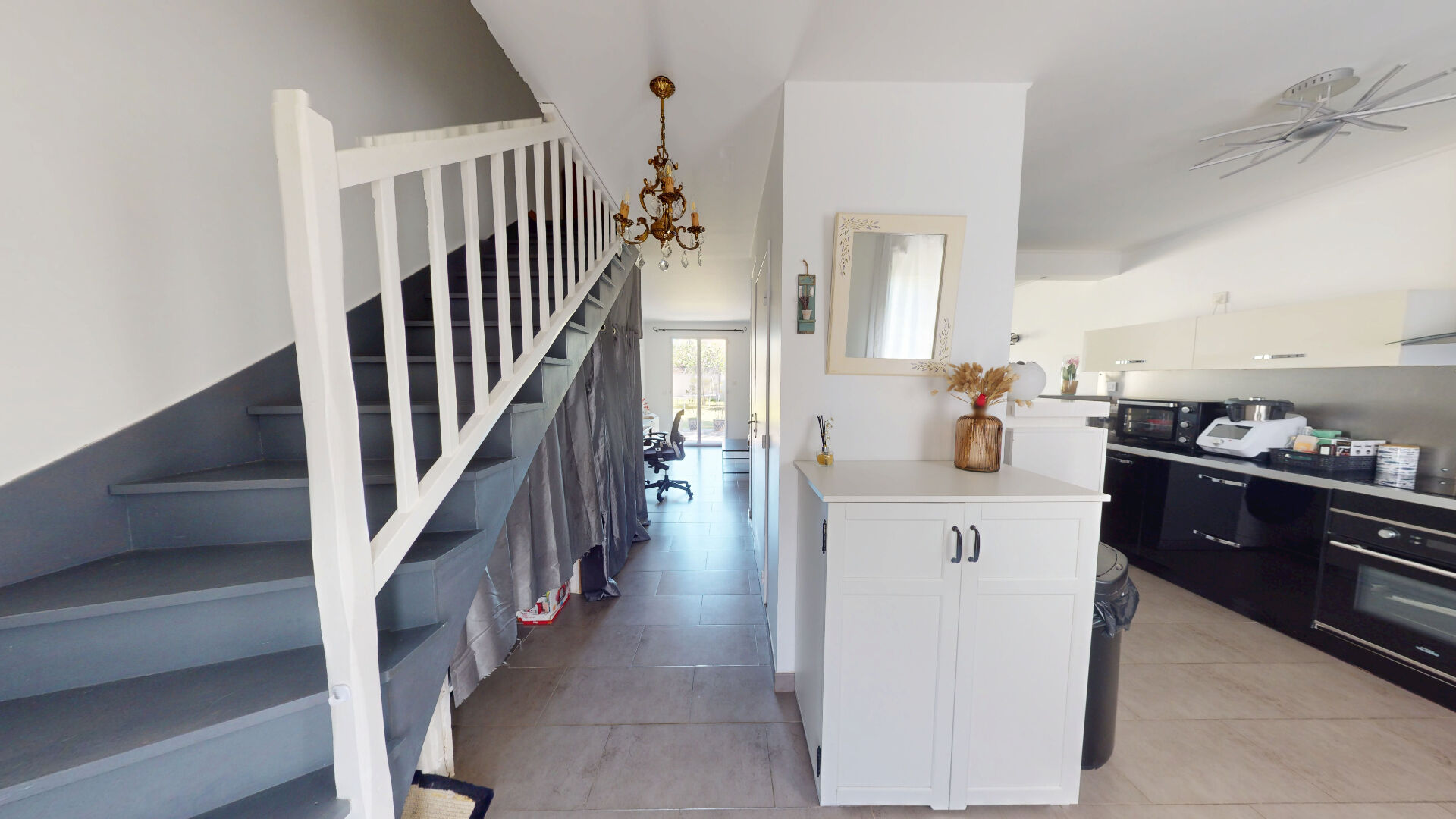 Au rez-de-chaussée, une entrée dessert un séjour lumineux avec accès direct à une agréable terrasse d'environ 15m² et au jardin, une cuisine ouverte aménagée et équipée, un WC avec lave-mains ainsi que des espaces de rangement dont un sous escalier.