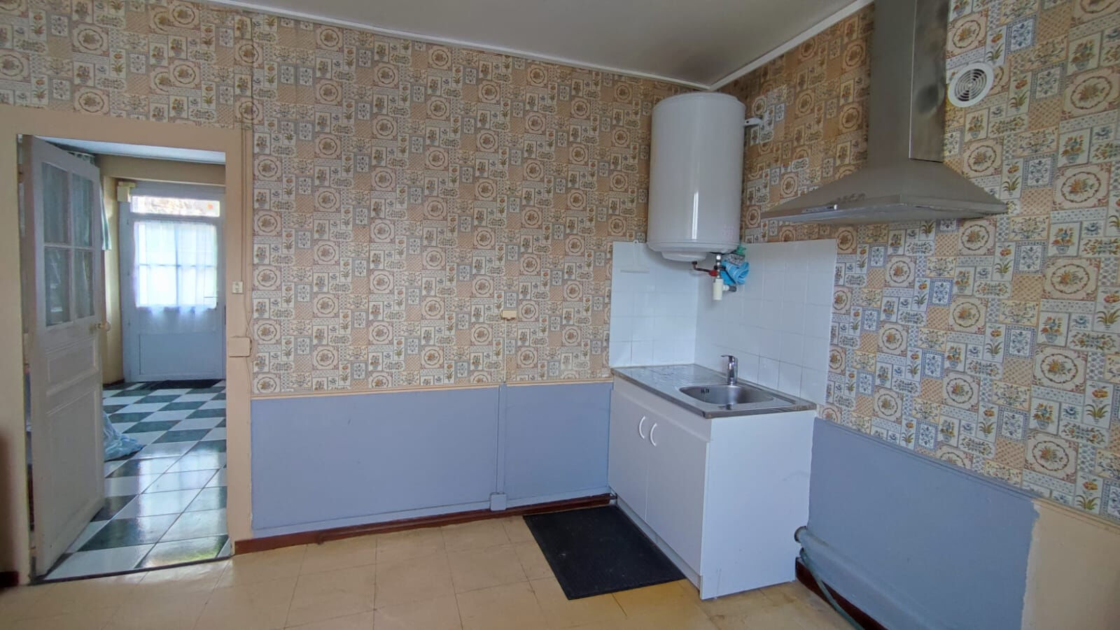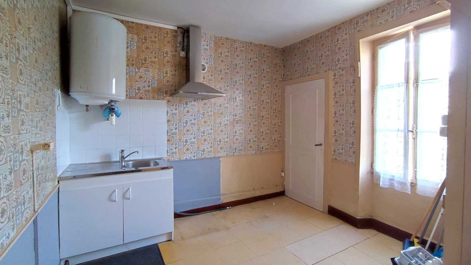 Rez-de-chaussée : salon-séjour, cuisine nue, salle d'eau, WC, 2 chambres.