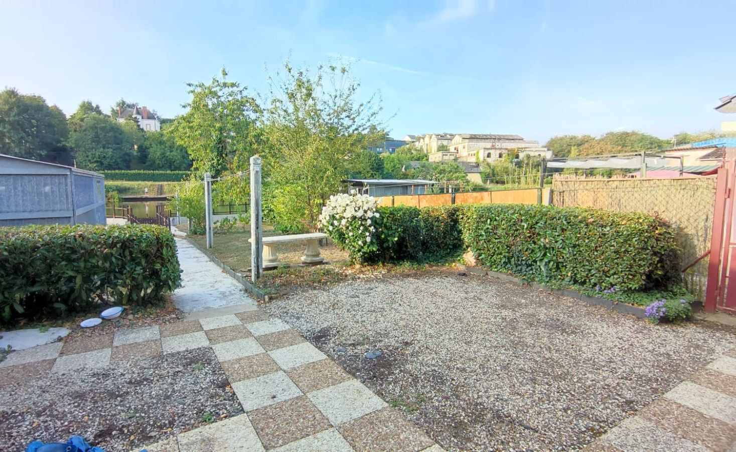 Extérieur : jardin paysager avec vue imprenable sur la rivière + espaces de stockage.