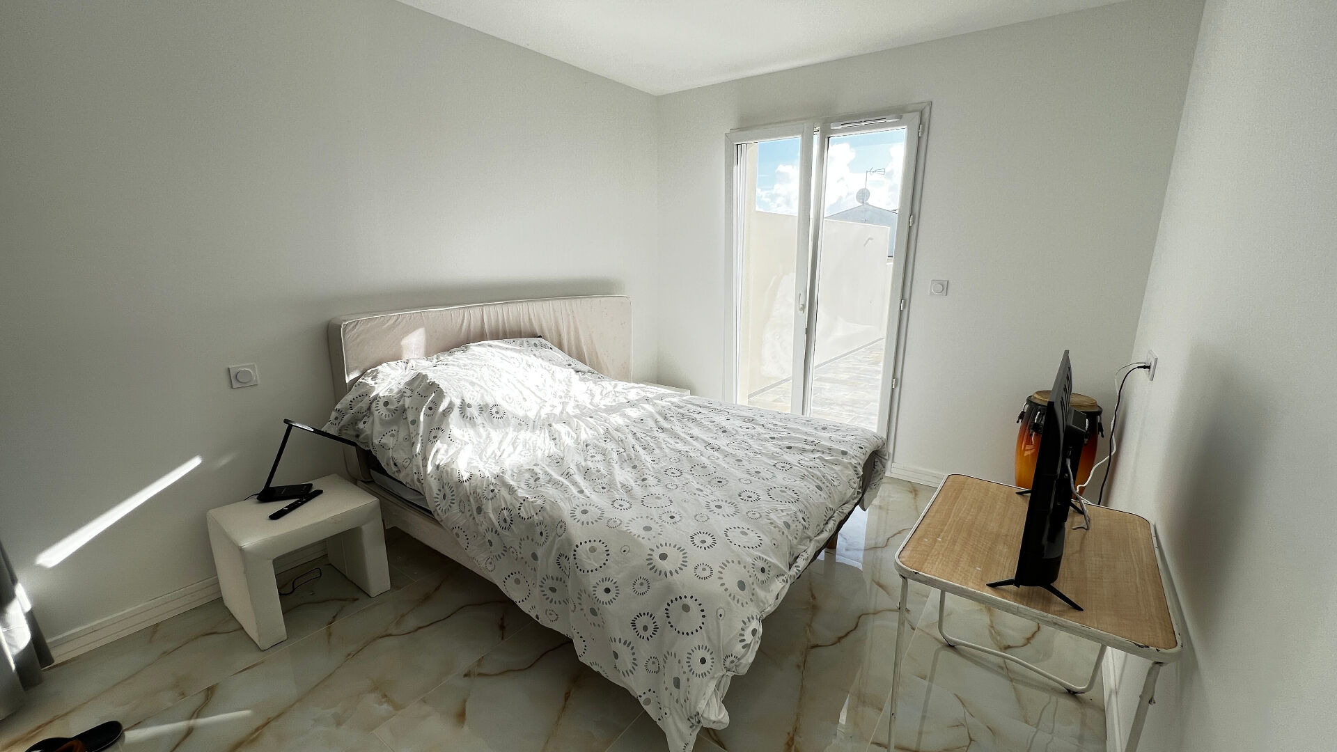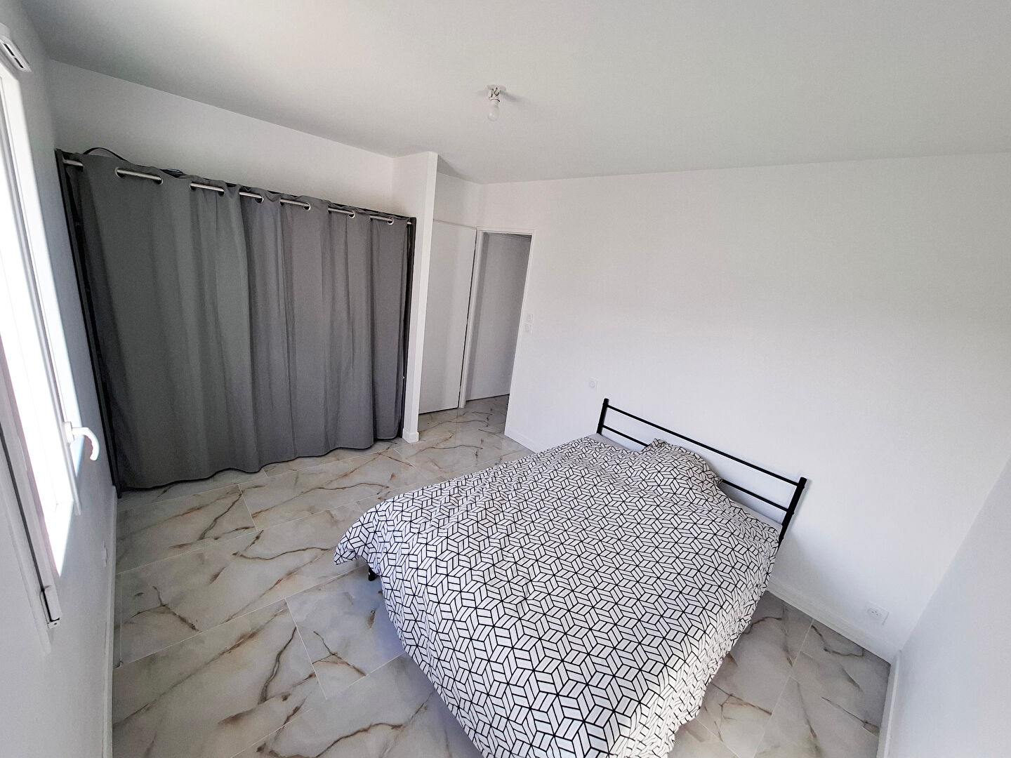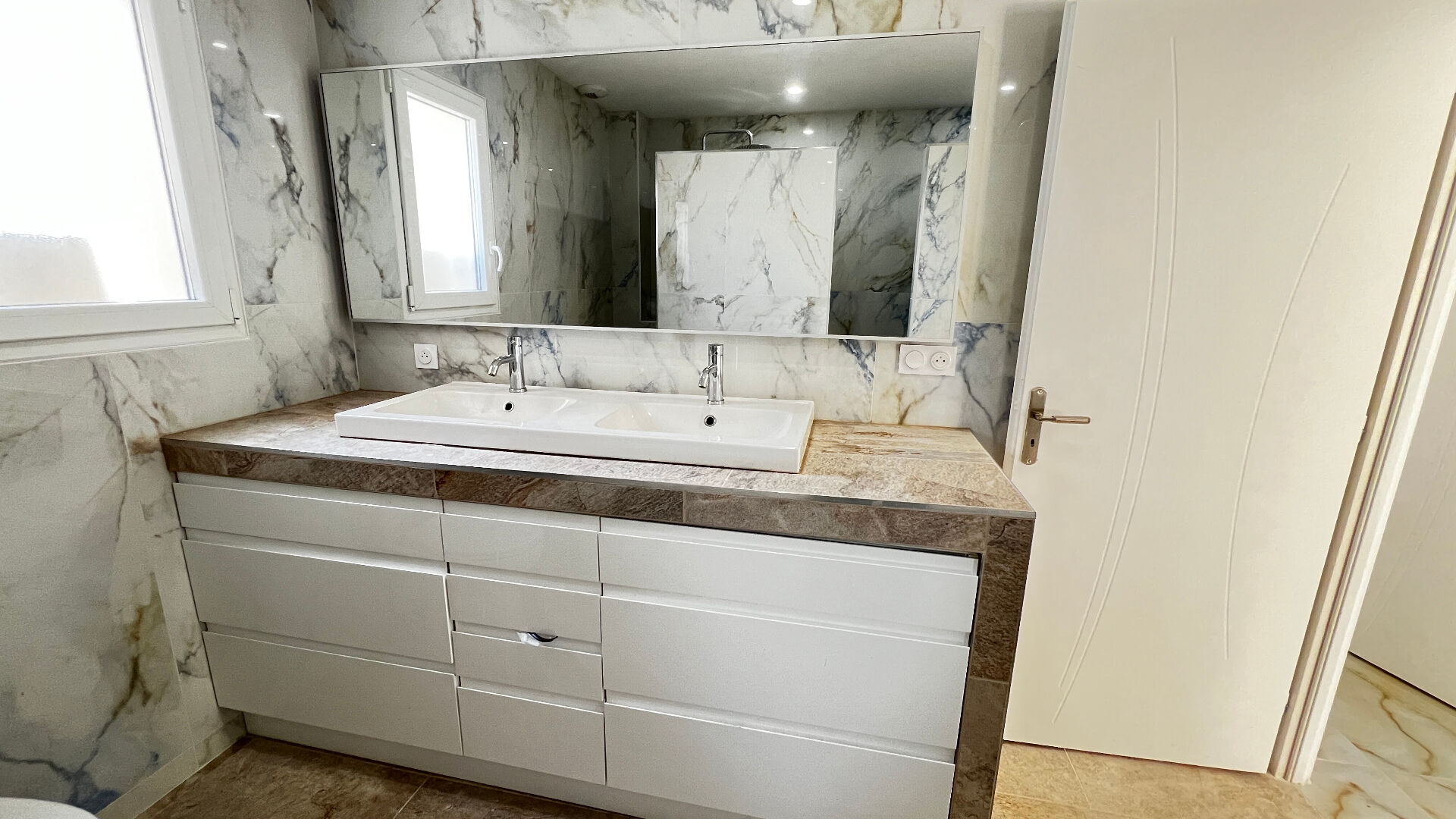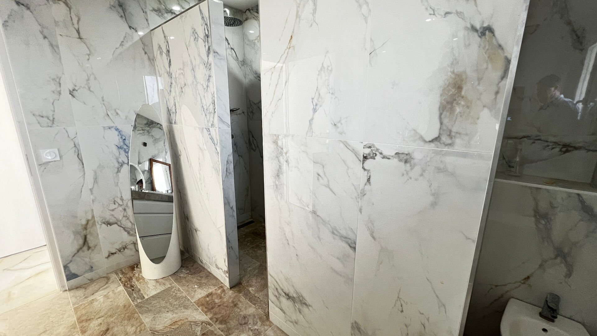 Élégant et très bien pensé, l'ensemble est habillé avec un carrelage marbrée magnifique.