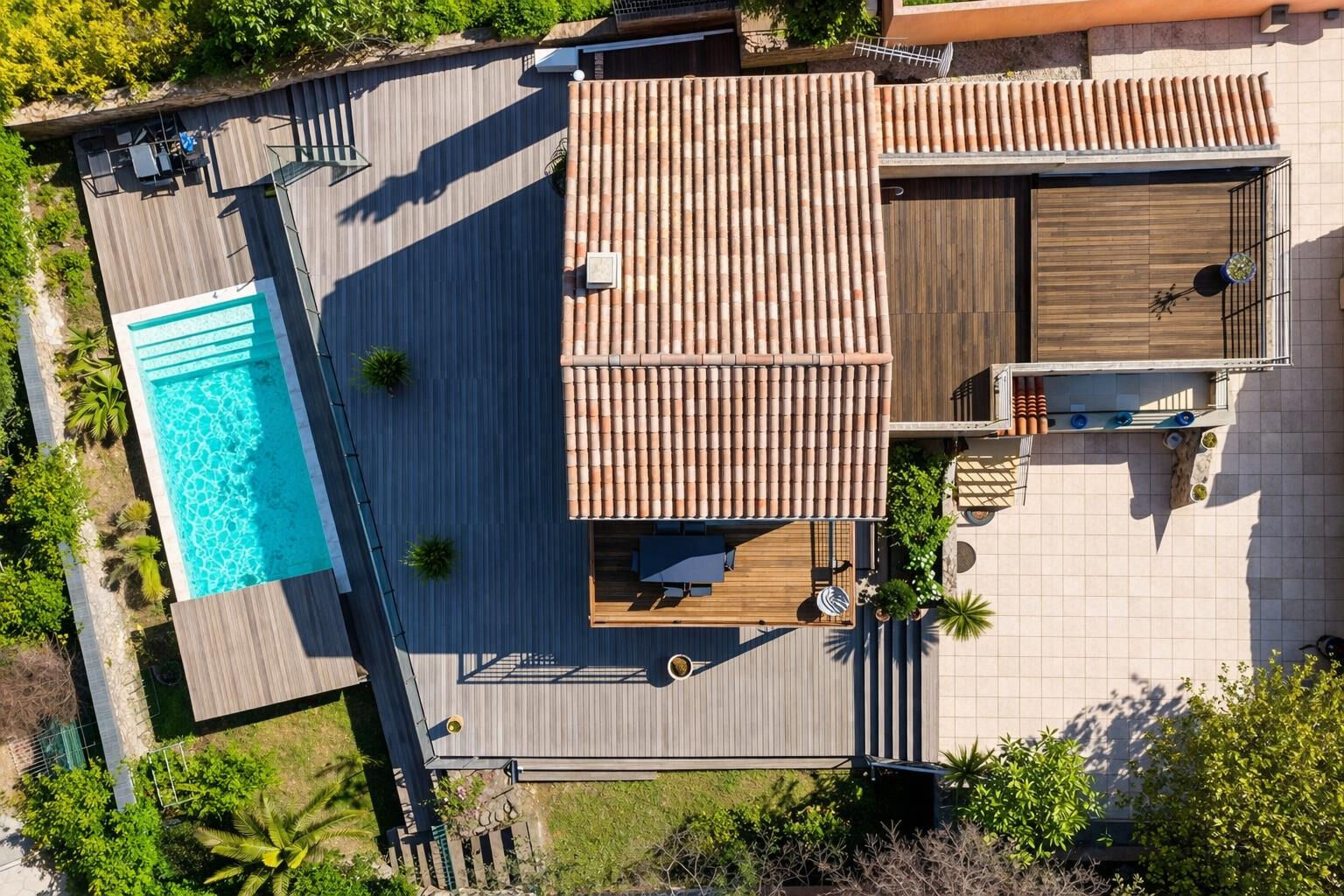 À l'extérieur, les différents espaces de vie s'articulent autour de la piscine chauffée et traitée au sel, parfaitement intégrée, et une grande terrasse en bois exotique aux expositions variées, permettant de profiter pleinement de chaque instant, du lever au coucher du soleil.
