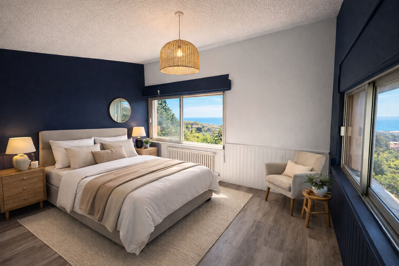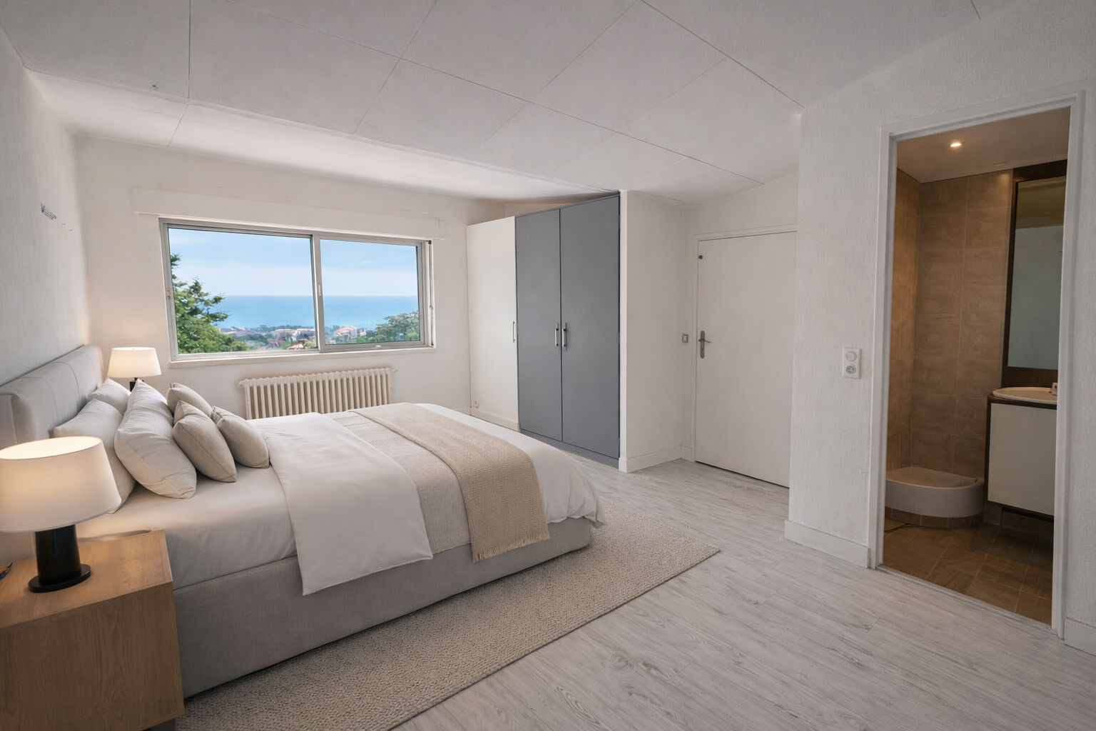 Le niveau principal accueille également une suite parentale confortable de 25 m², ouverte sur la terrasse et la mer, composée d'une chambre et de sa salle de bain avec w-c.