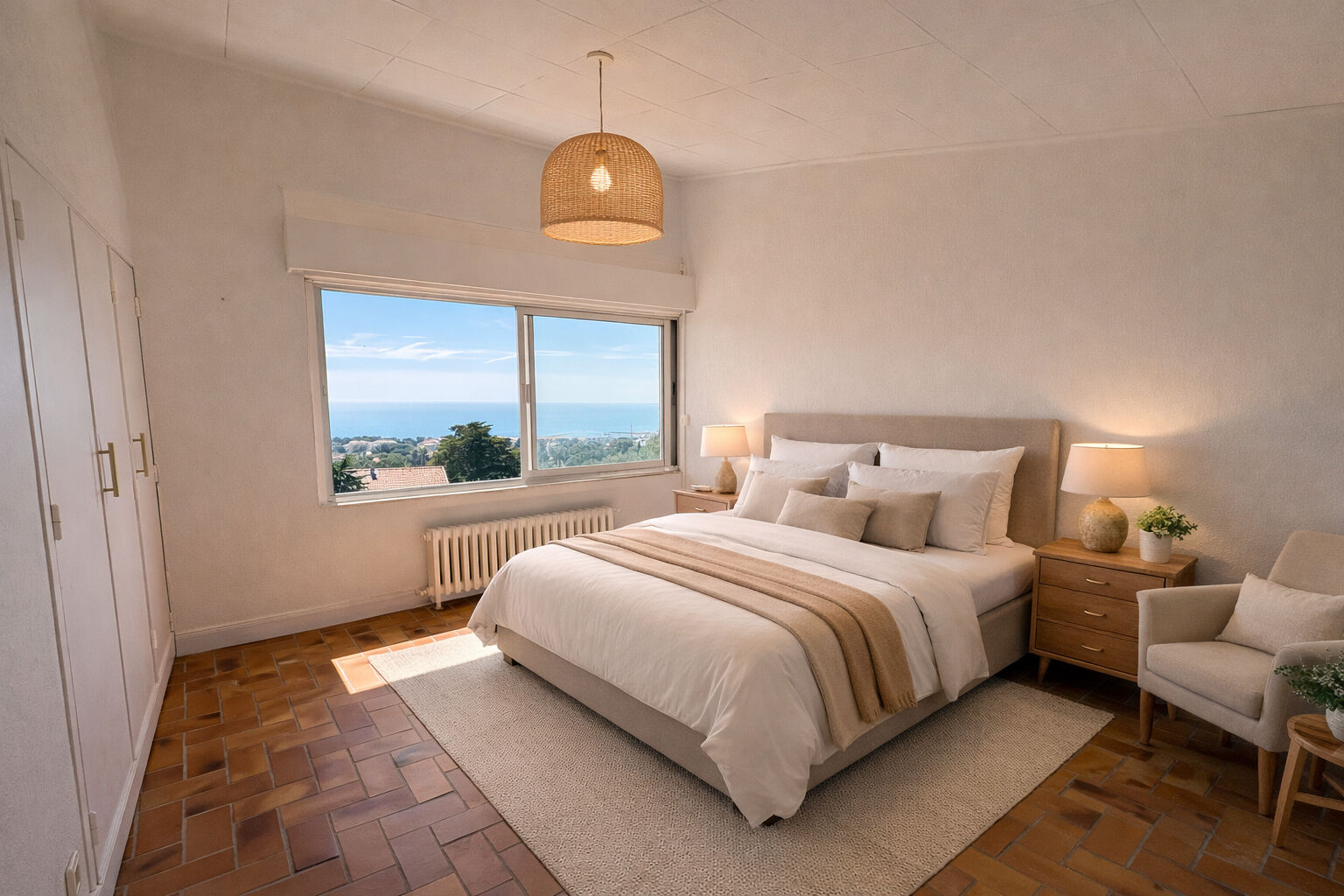 À l'étage, trois chambres prennent place, dont une grande chambre d'environ 19 m² avec sa salle d'eau. L'ensemble des chambres bénéficie d'une vue ouverte sur la mer, offrant à chaque espace une relation privilégiée avec le paysage. Une salle d'eau complémentaire, un w-c ainsi que des espaces de rangement viennent compléter ce niveau.