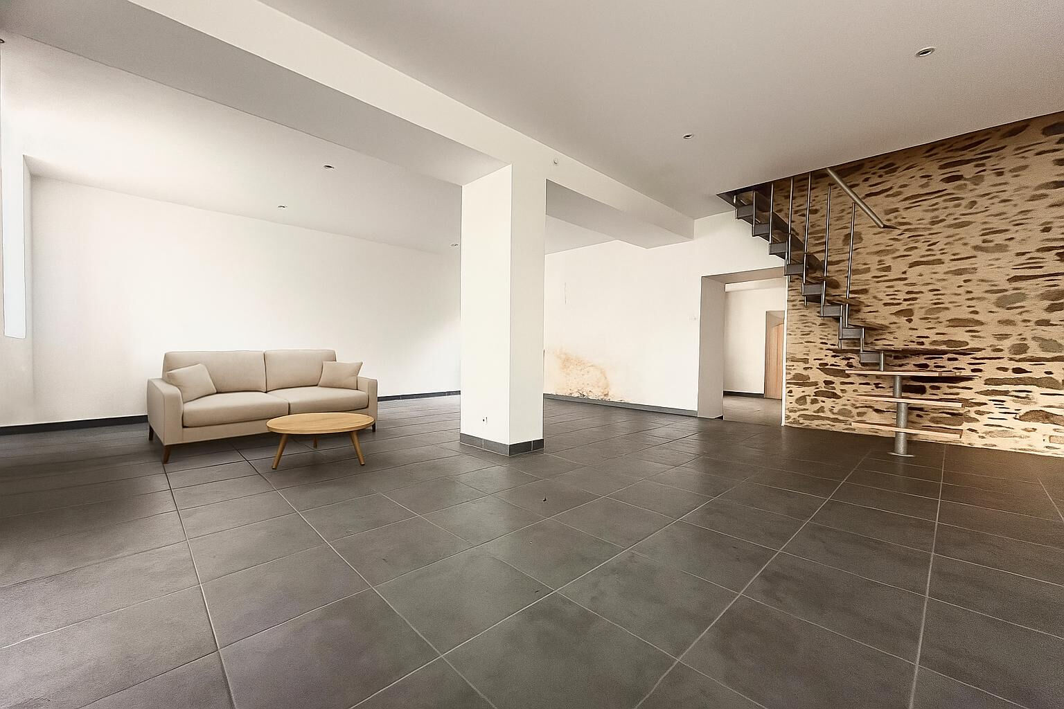 Un mur en pierre, élément central de la maison, apporte du caractère à l'espace de vie.