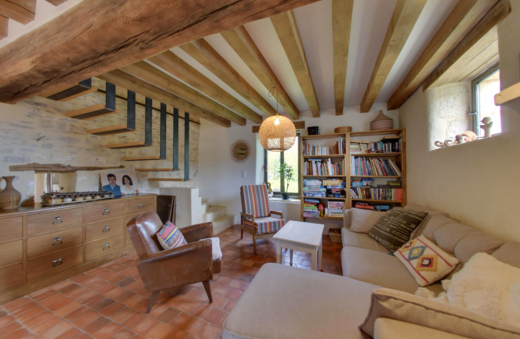 La maison principale offre une grande pièce de vie lumineuse, idéale pour partager des moments en famille ou entre amis.