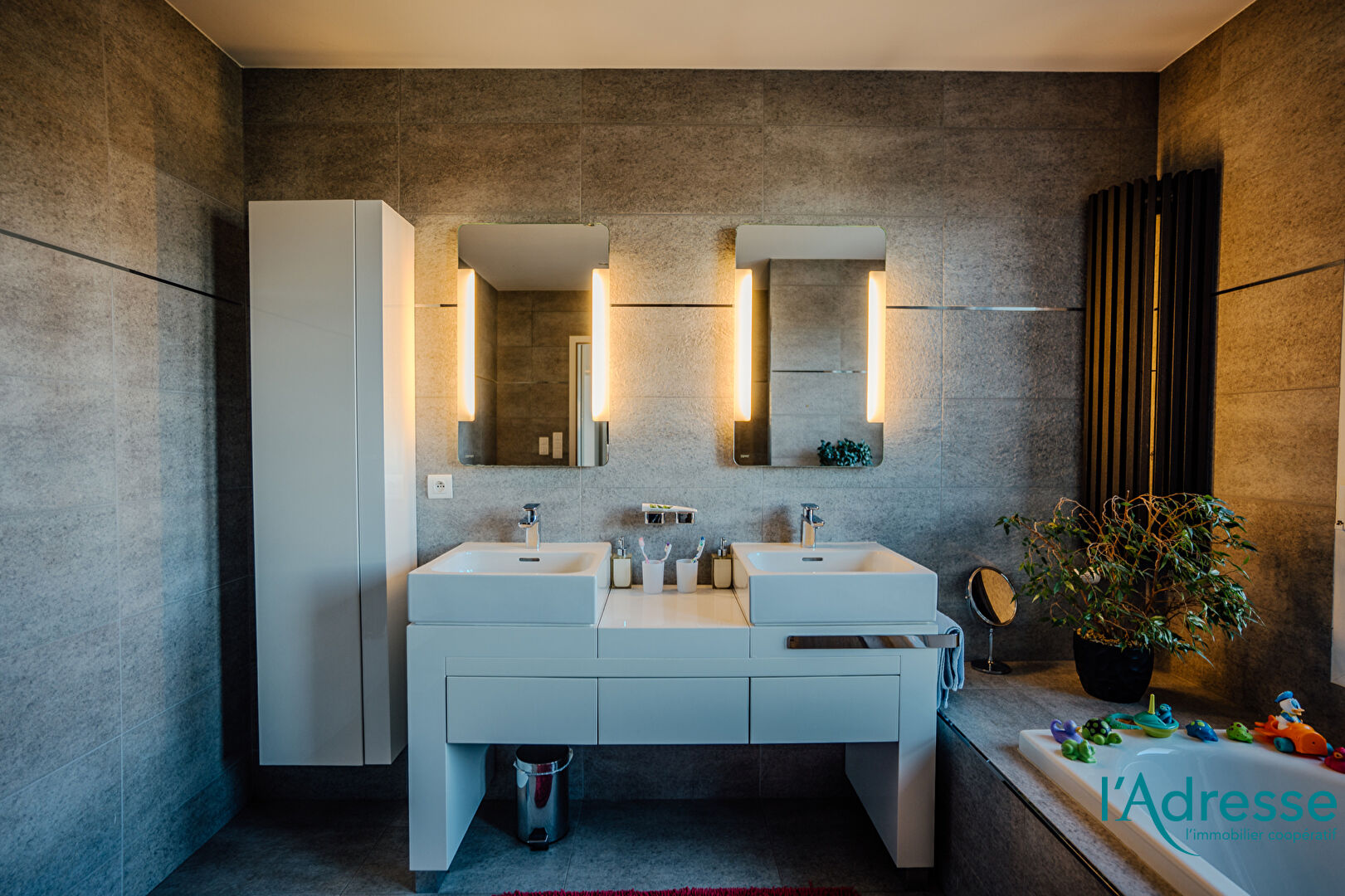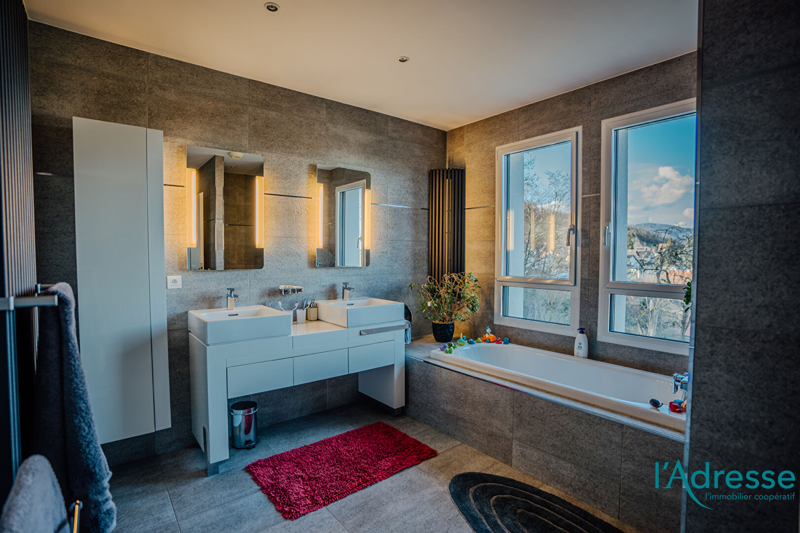 - Salle de bains complète avec double vasque, douche et baignoire