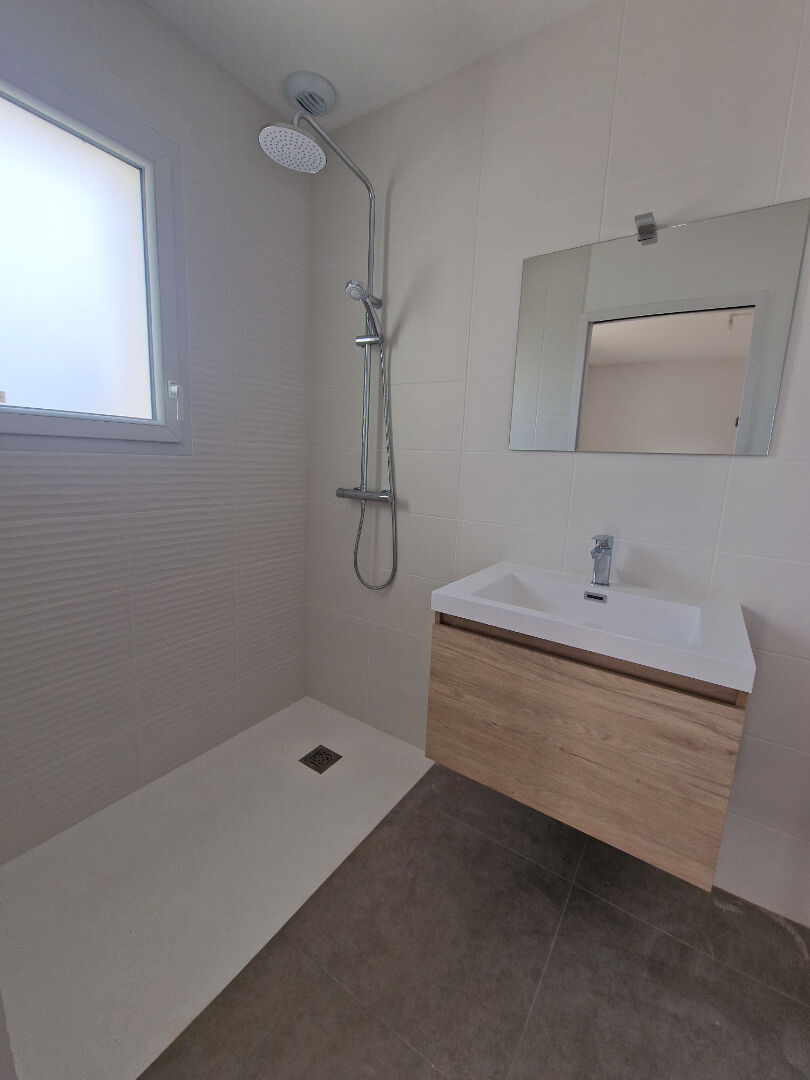 Elle se compose d'une pièce de vie avec cuisine aménagée, un wc, deux chambres, une salle d'eau avec wc, une suite parentale avec salle d'eau et un garage.