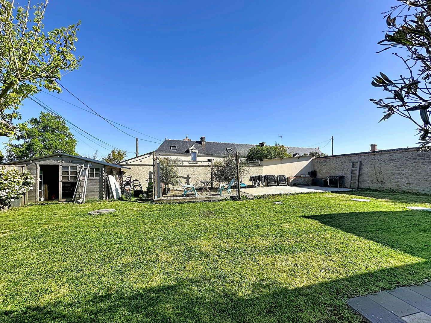 À l'extérieur, le terrain clos d'environ 550 m² offre un cadre paisible pour profiter de la campagne environnante, avec un abri de jardin idéal pour le rangement ou les loisirs.