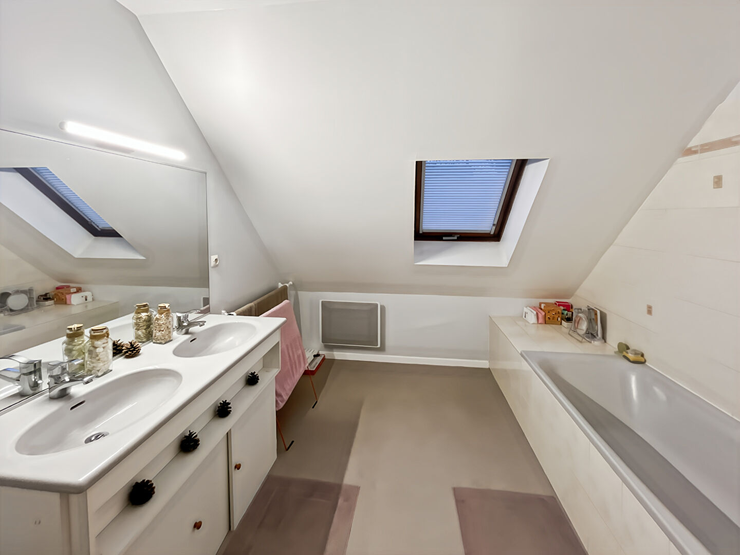 À l'étage, un palier aménagé en espace bureau dessert trois chambres dont une avec sa salle d'eau, une salle de bains et des toilettes, apportant confort et fonctionnalité au quotidien.