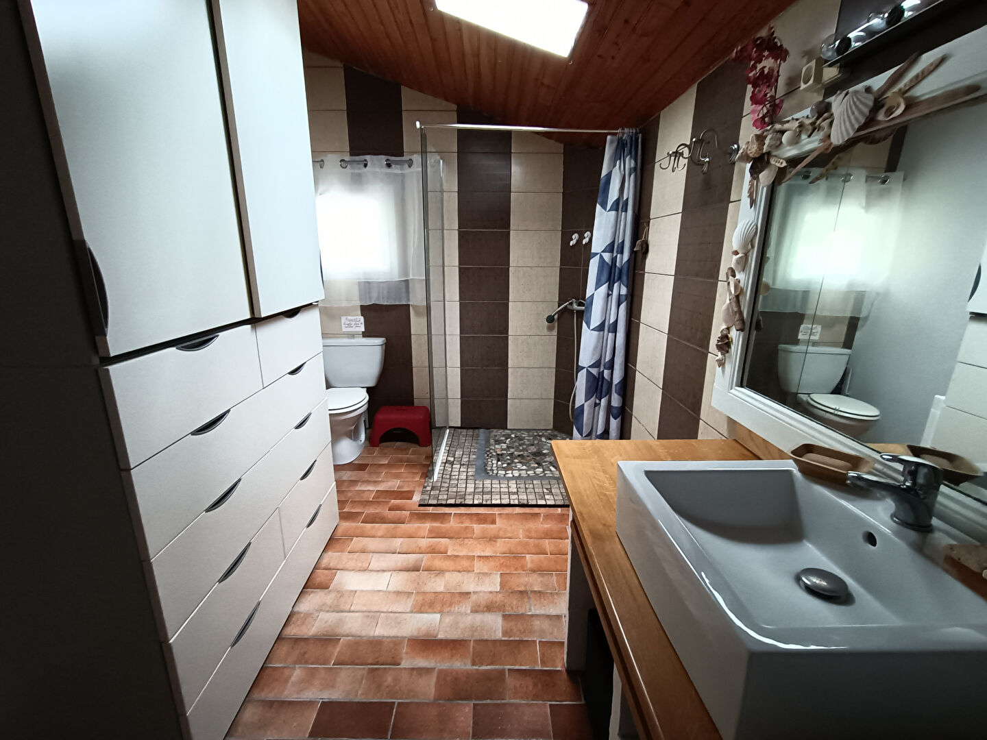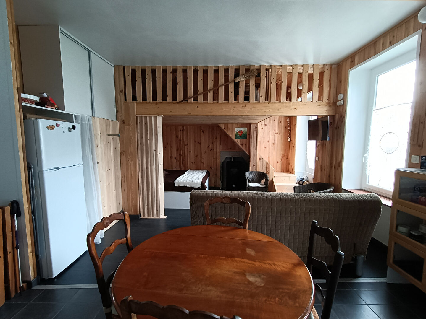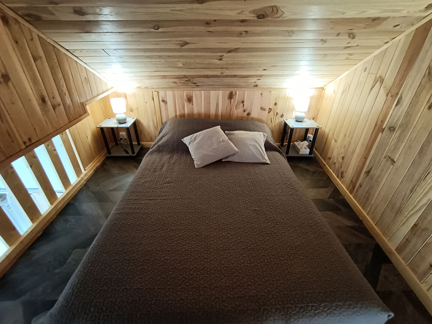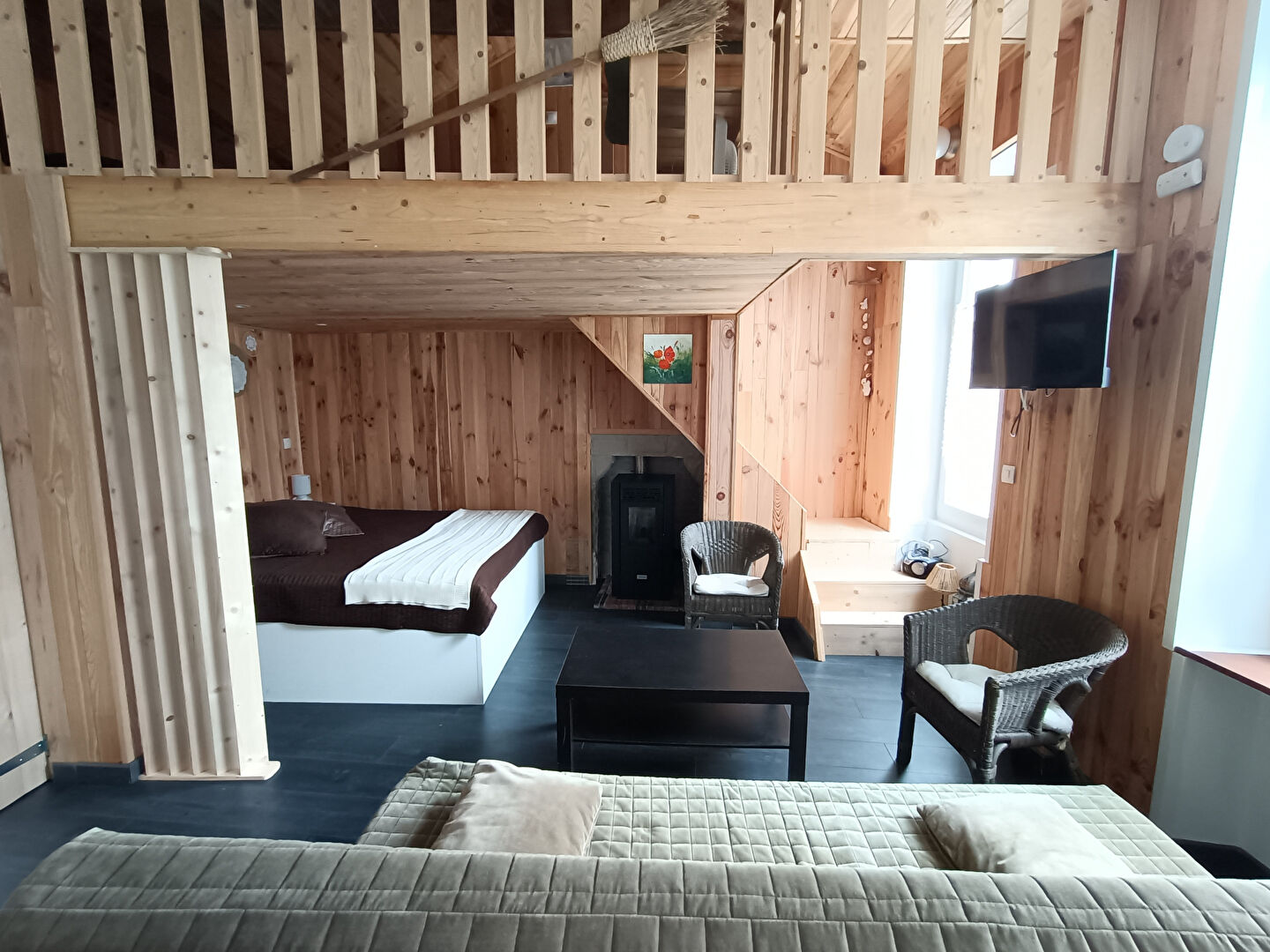 Elle se compose d'une pièce de vie avec cuisine ouverte aménagée et équipée, salle à manger et salon doté d'un poêle à granulés, ainsi que d'une salle d'eau avec WC. Une mezzanine comprenant l'espace nuit complète l'ensemble.