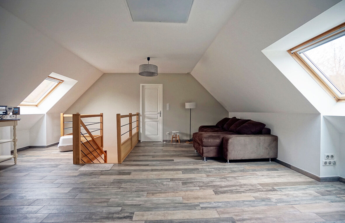 L'étage est desservi d'un grand palier de 30m² pouvant faire office de salle de jeux, 2 belles chambres et une salle de bain.