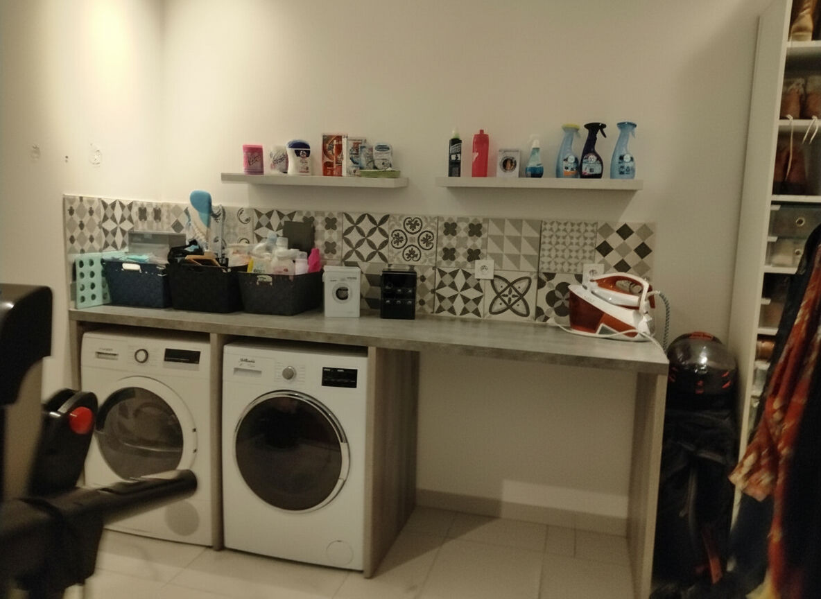 Un grand garage utilisé en lingerie buanderie ,cellier.